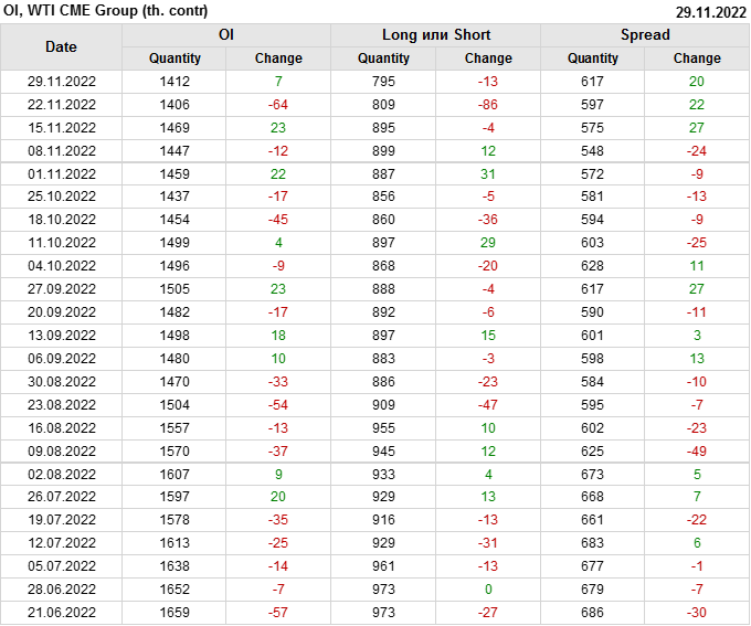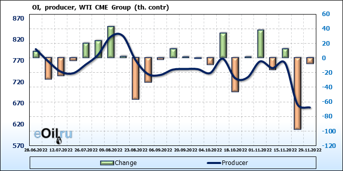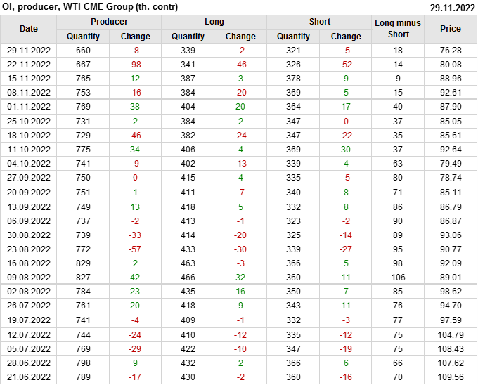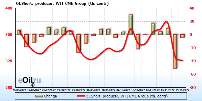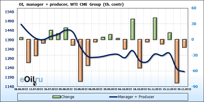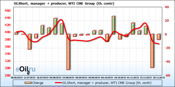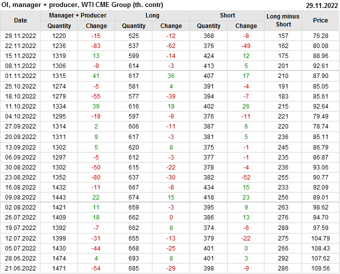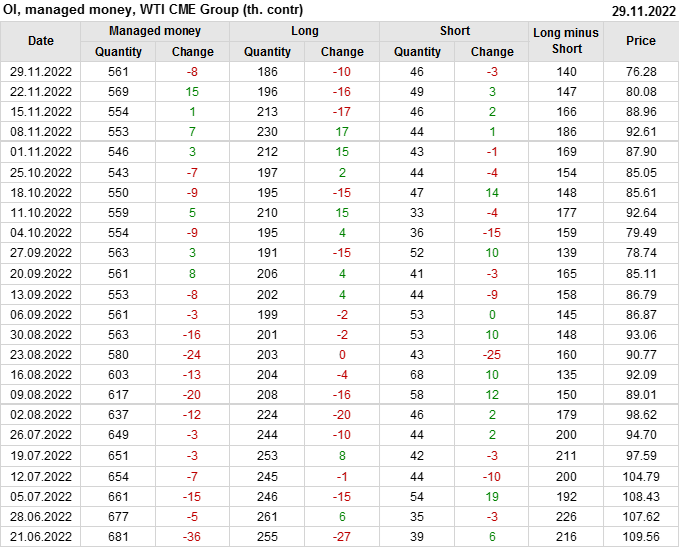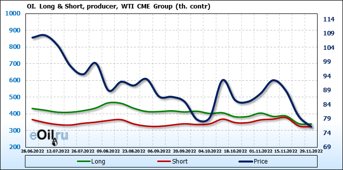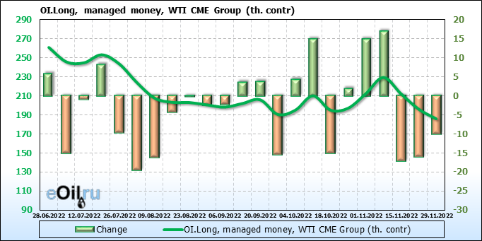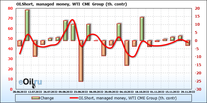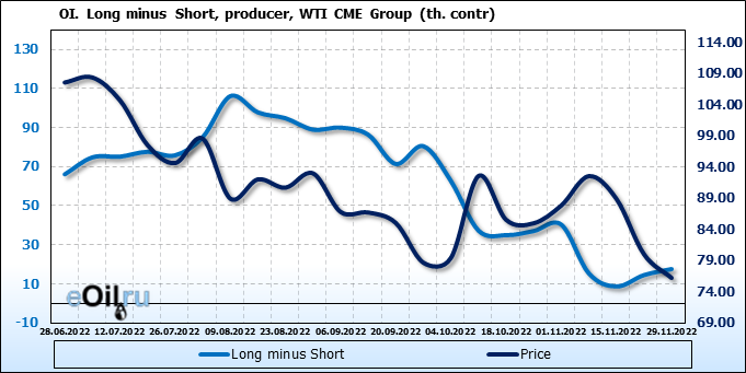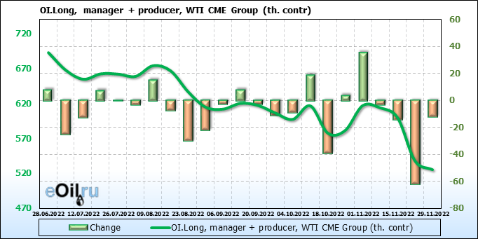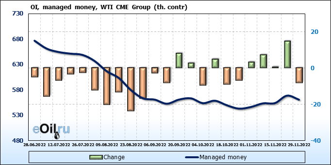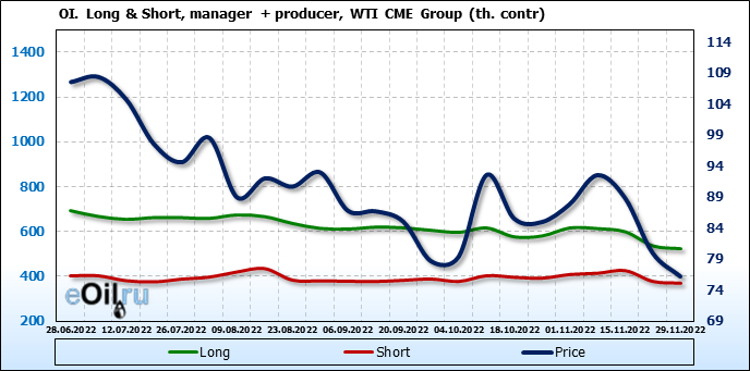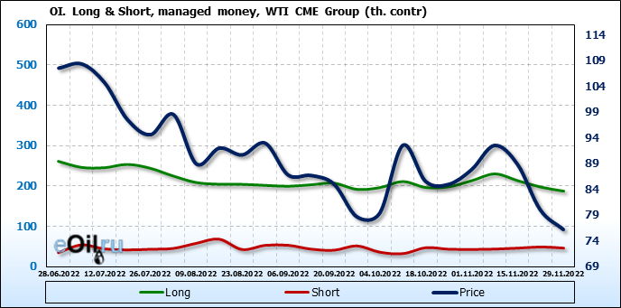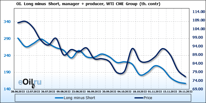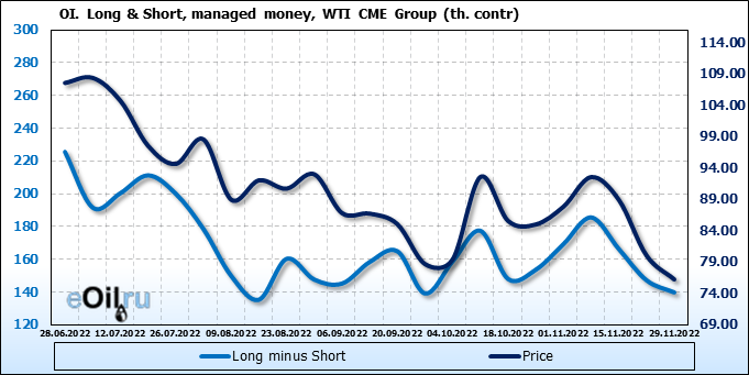 За прошлую неделю, 23.11.22 — 29.11.22, разница между длинными и короткими позициями управляющих сократилась на 7.4 тыс. контрактов. В тоже время, цена упала на 3.8 доллара.