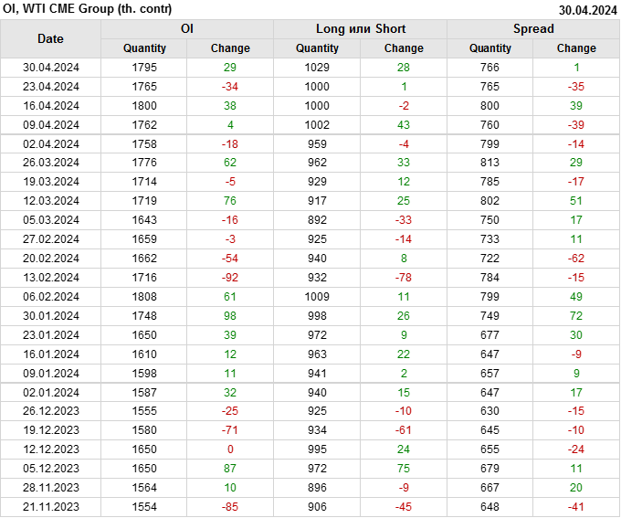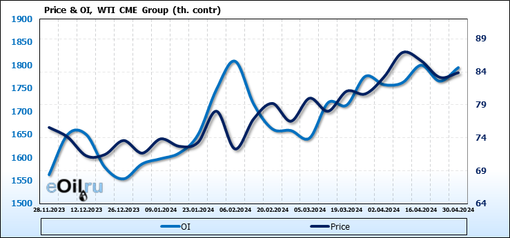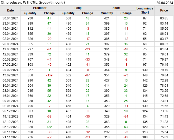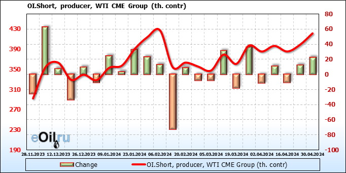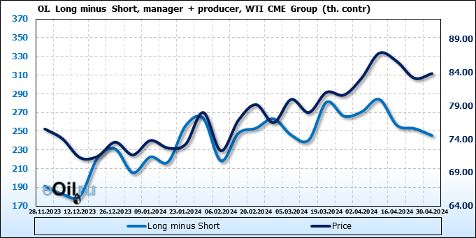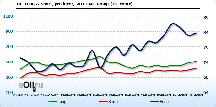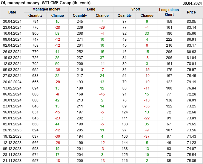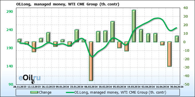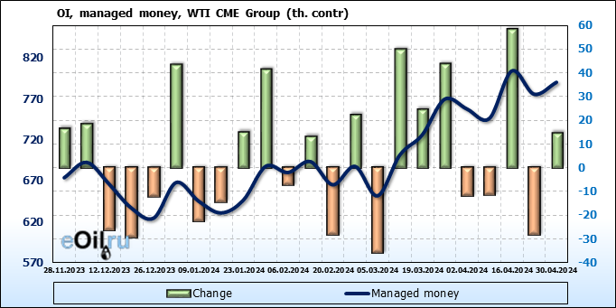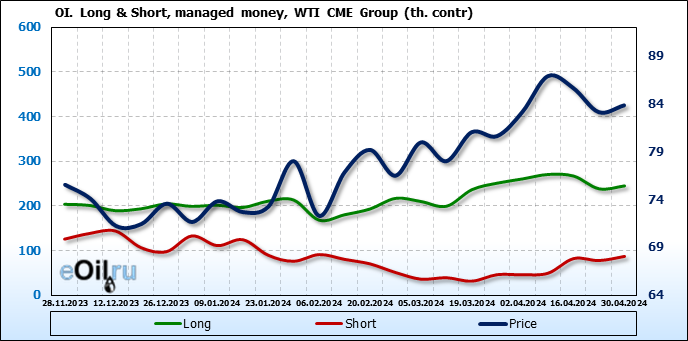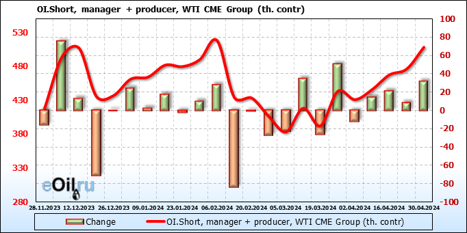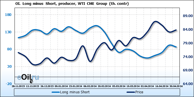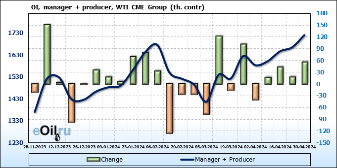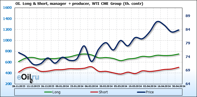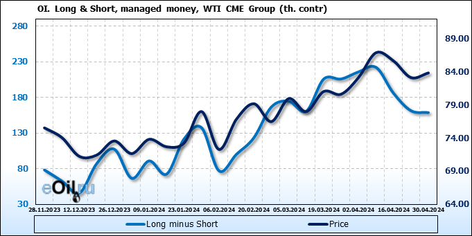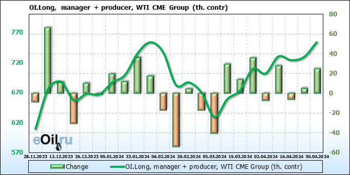 За прошлую неделю, 24.04.24 — 30.04.24, разница между длинными и короткими позициями управляющих сократилась на 2.7 тыс. контрактов. В тоже время, цена выросла на 0.71 доллара.