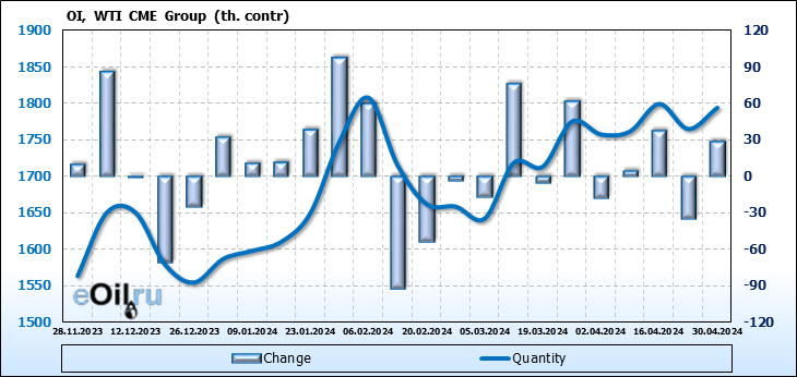 За прошлую неделю, 24.04.24 — 30.04.24, открытый интерес вырос на 29 тыс. контрактов. Объем вовлеченных в торговлю контрактов составляет 1 794 542 штуки. Текущее положение дел на рынке таково, что деньги в течение прошлой недели приходили на рынок поддерживая тенденцию.