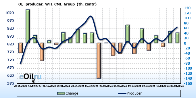 Открытый интерес производителей вырос на 41 тыс. контрактов. Объем контрактов, направленных на хеджирование, составляет 929 833 штуки. Деньги производителей в течение прошлой недели приходили на рынок поддерживая тенденцию.