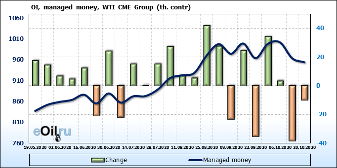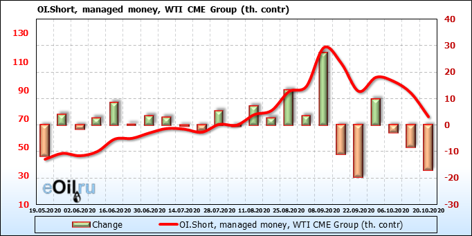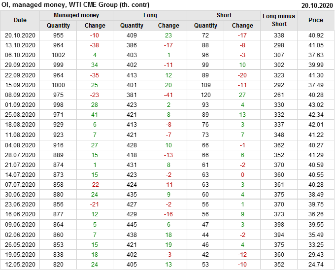 За прошлую неделю, 23.09.20 — 29.09.20, разница между длинными и короткими позициями управляющих упала на 21 тыс. контрактов. В тоже время, цена упала на 1.31 доллара. Наращивание коротких позиций спекулянтами приводит к падению цен. Если давление со стороны медведей продолжится, то мы можем увидеть новые минимумы.