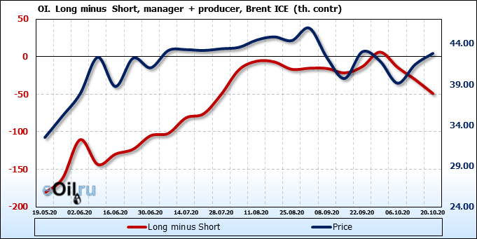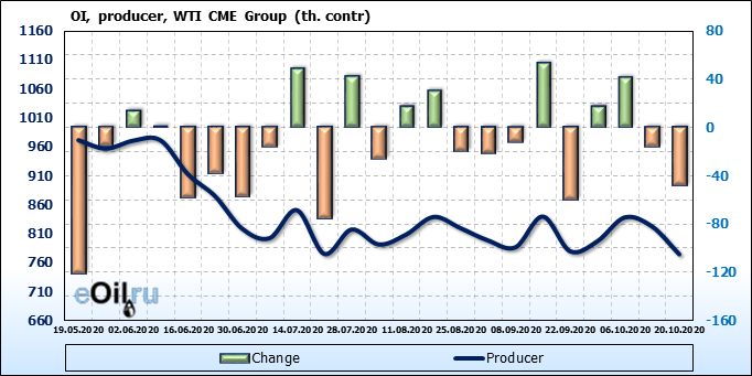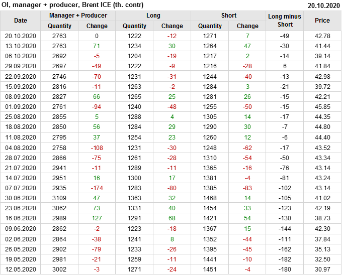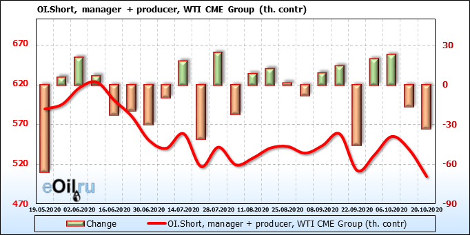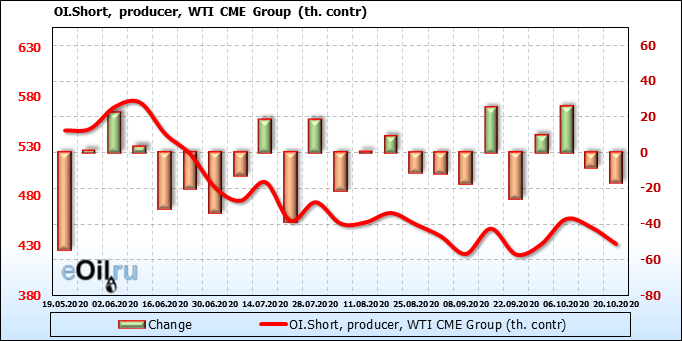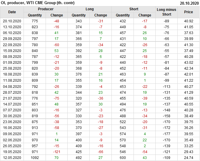 За прошлую неделю, 23.09.20 — 29.09.20, разница между длинными и короткими позициями производителей упала на 3 тыс. контрактов. В тоже время, цена упала на 1.31 доллара. Производители наращивают короткие позиции, что не дает цене расти. В такой ситуации на рынке возможно ускорение падения цен.