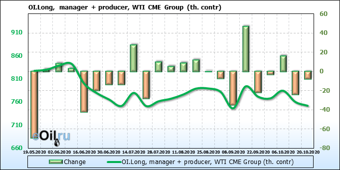 За прошлую неделю, 23.09.20 — 29.09.20, разница между длинными и короткими позициями производителей и управляющих упала на 24 тыс. контрактов. За отчетный период времени, цена упала на 1.31 доллара. Производители и управляющие на отчетной недели были склонны продавать. Суммарное число шортов было выше суммарного числа лонгов. Цены также снижаются, что создает привлекательные условия для продавцов в среднесрочной перспективе, одна — две недели.