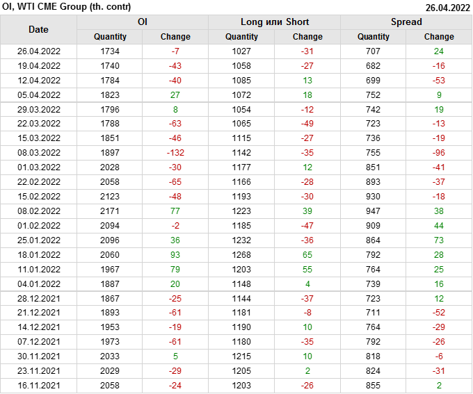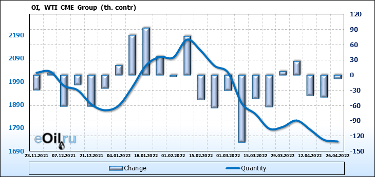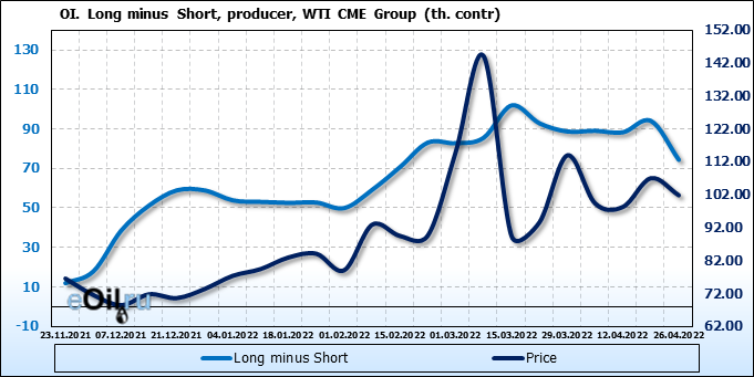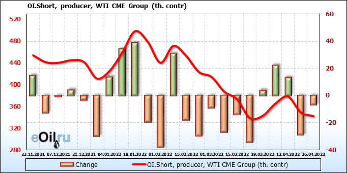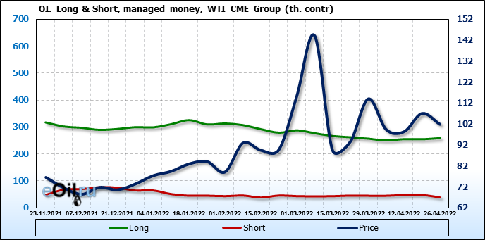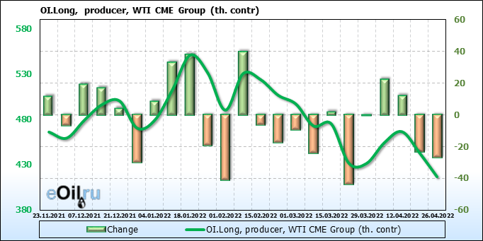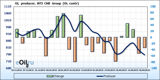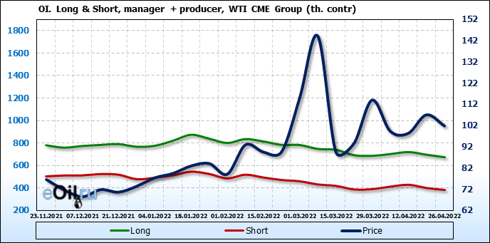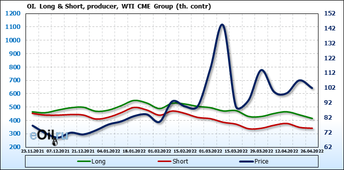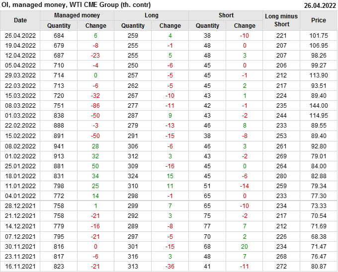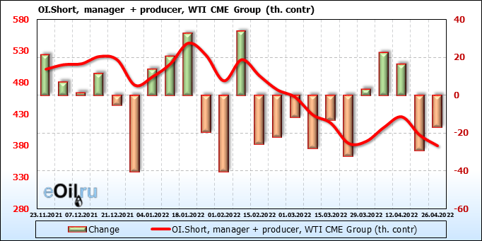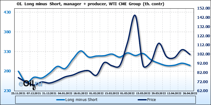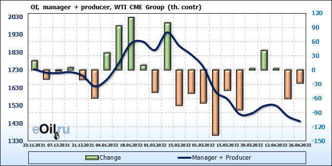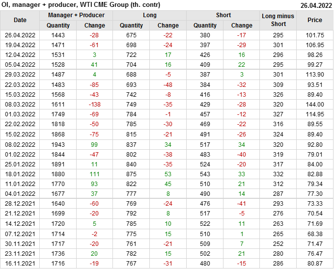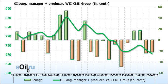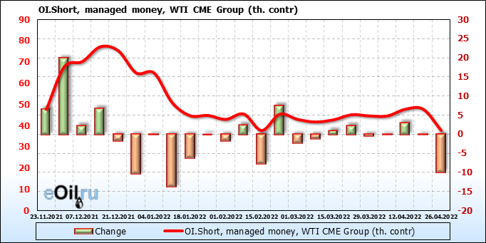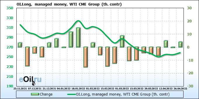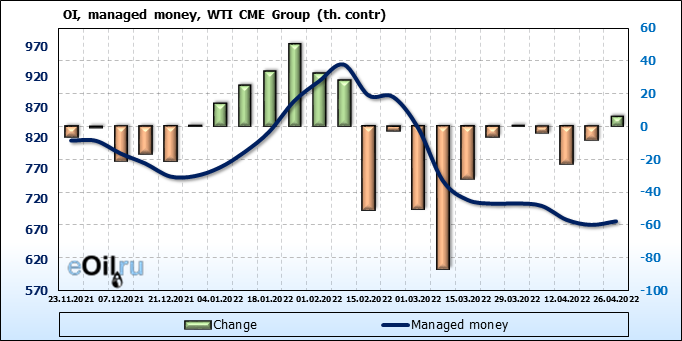За прошлую неделю, 20.04.22 — 26.04.22, разница между длинными и короткими позициями управляющих увеличилась на 14.2 тыс. контрактов. В тоже время, цена упала на 5.2 доллара.