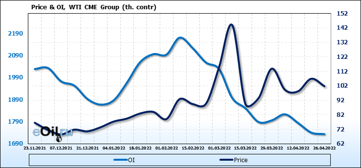За прошлую неделю, 20.04.22 — 26.04.22, открытый интерес упал на 7 тыс. контрактов. Объем вовлеченных в торговлю контрактов составляет 1 733 586 штук. Текущее положение дел на рынке таково, что деньги в течение прошлой недели уходили с рынка не видя привлекательности в текущей ситуации.
