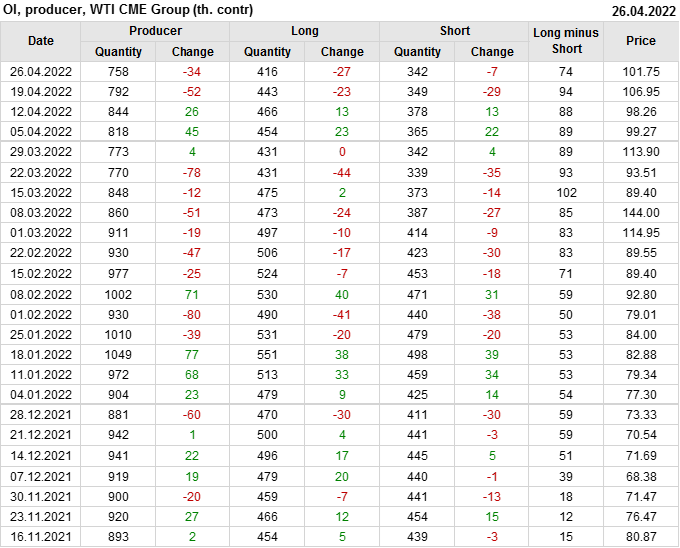 За неделю разница между длинными и короткими позициями производителей сократилась на 19.7 тыс. контрактов.