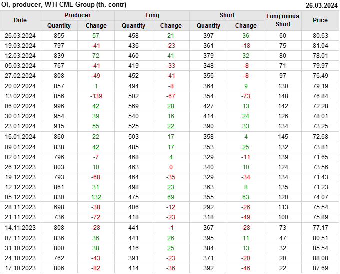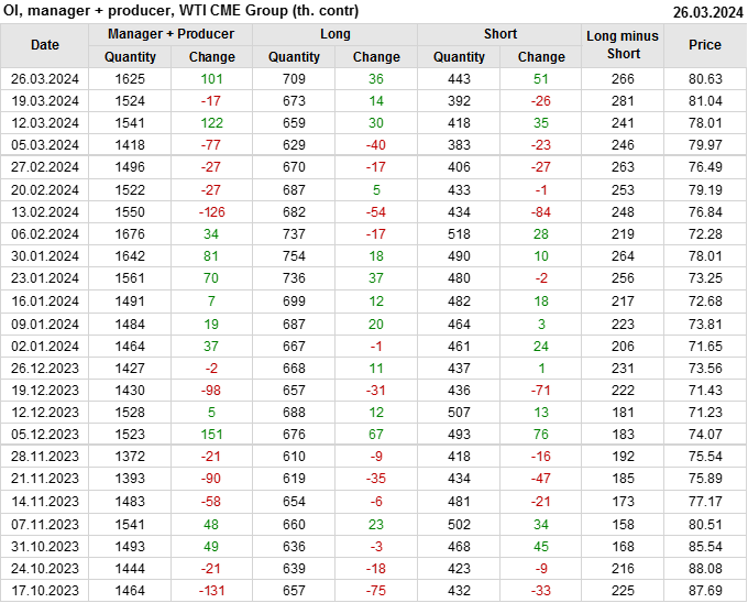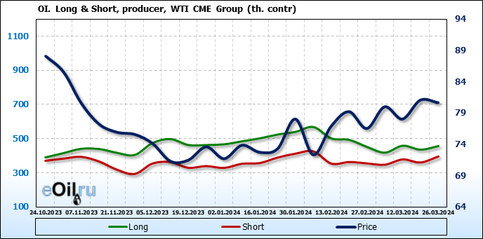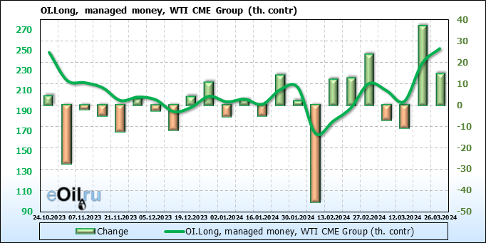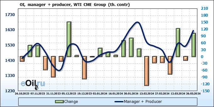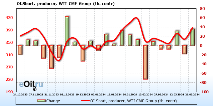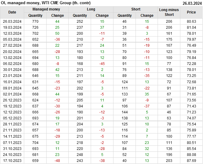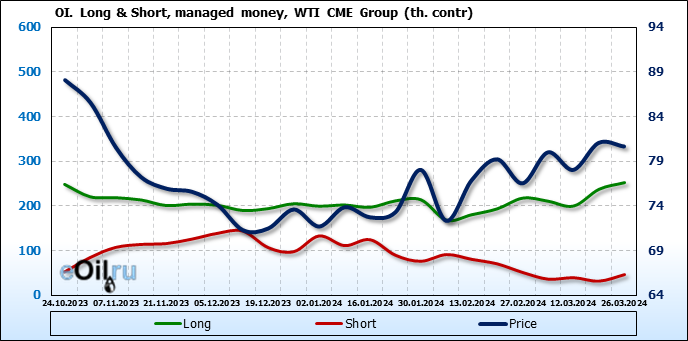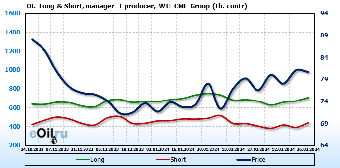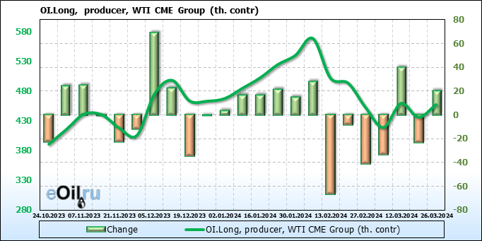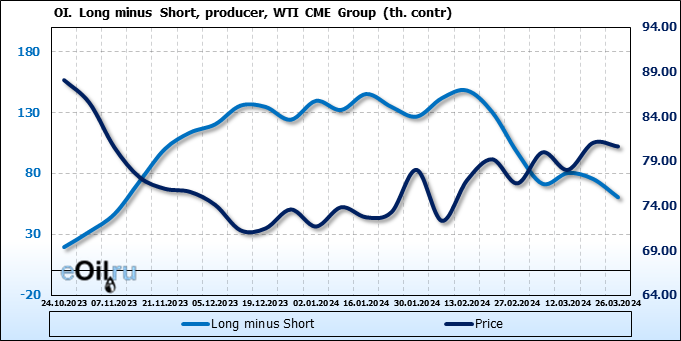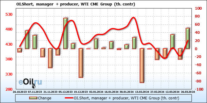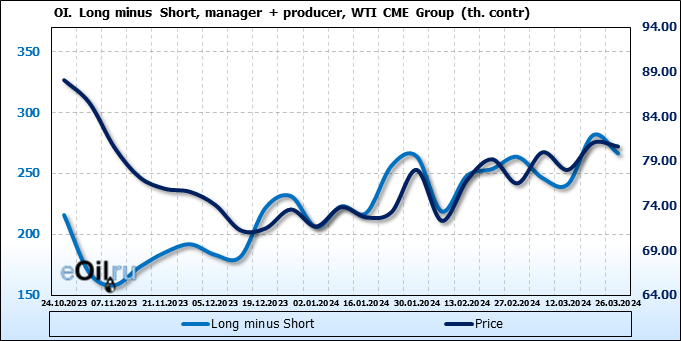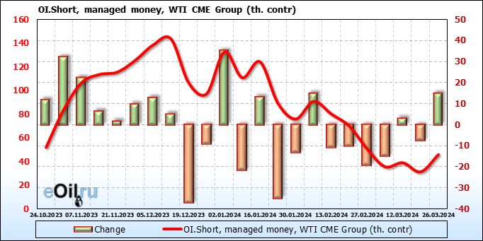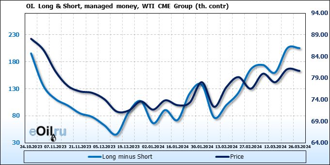 За прошлую неделю, 20.03.24 — 26.03.24, разница между длинными и короткими позициями управляющих увеличилась на 0.1 тыс. контрактов. В тоже время, цена упала на 0.41 доллара.