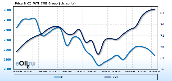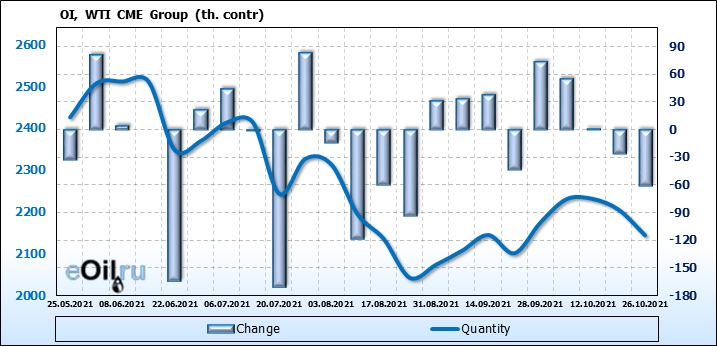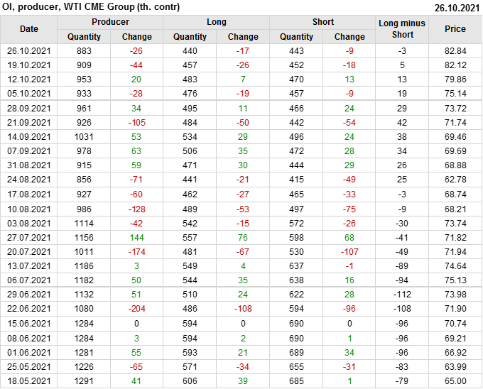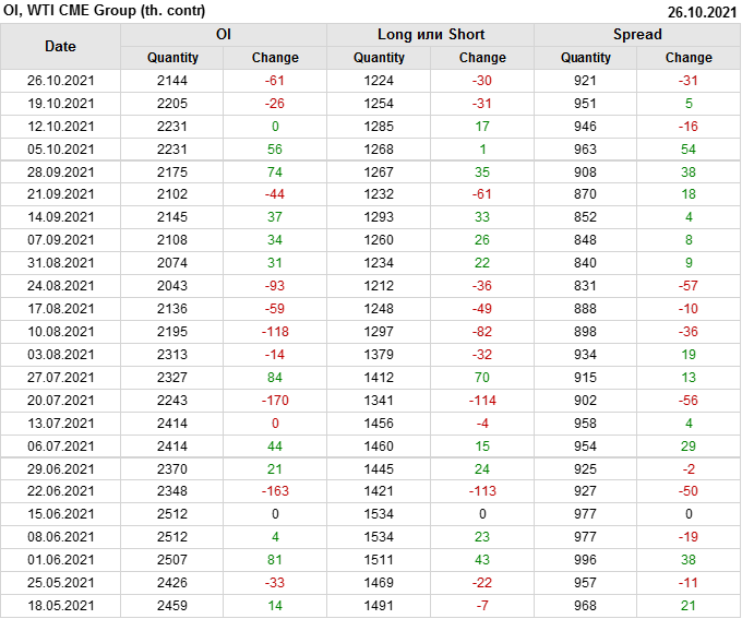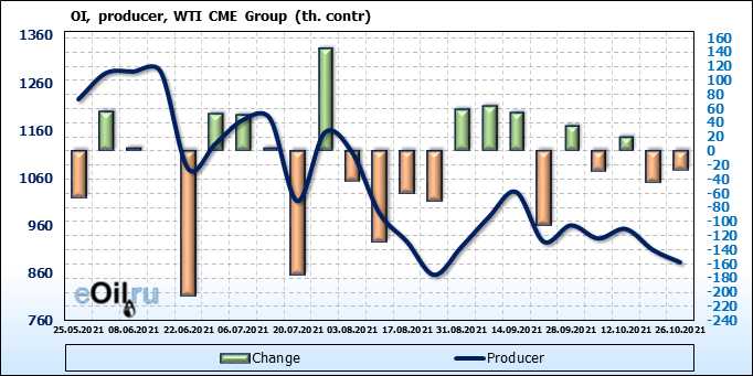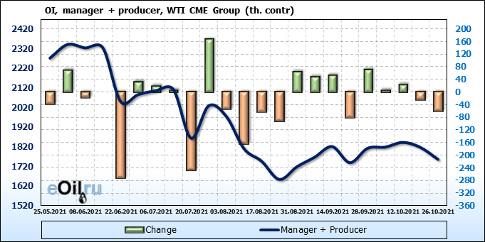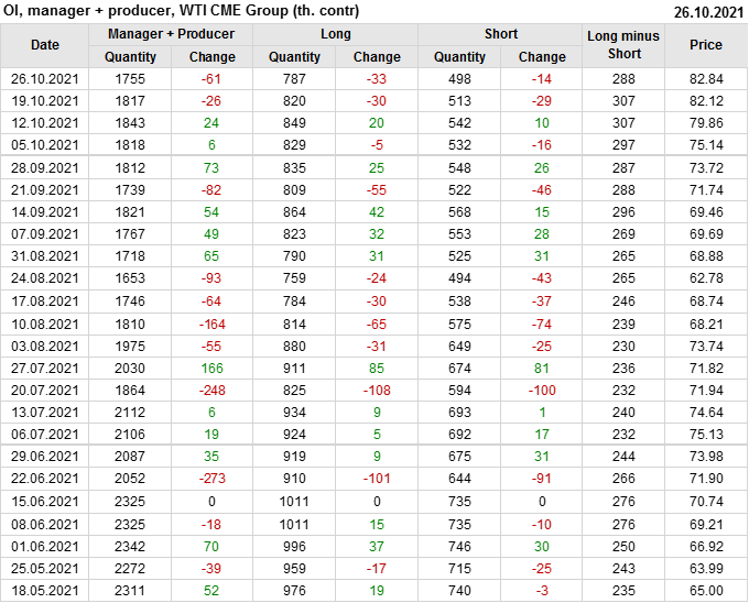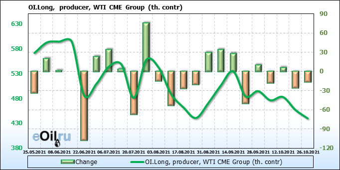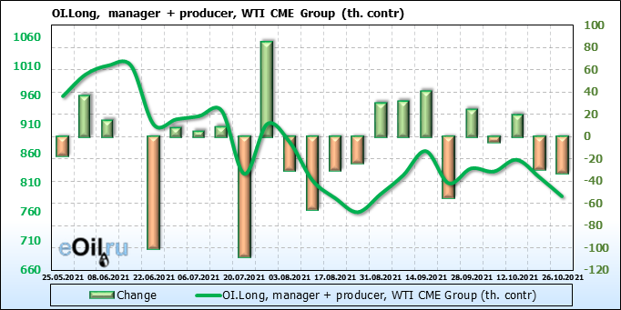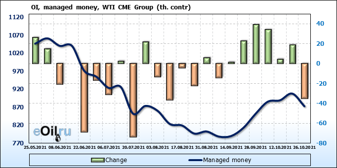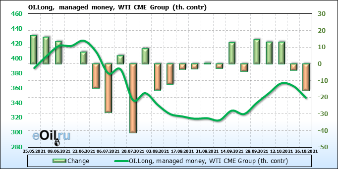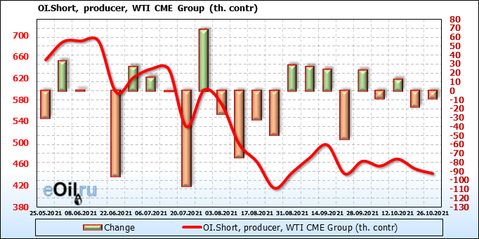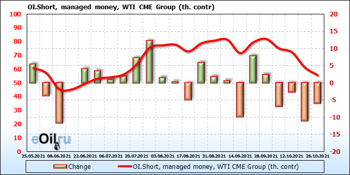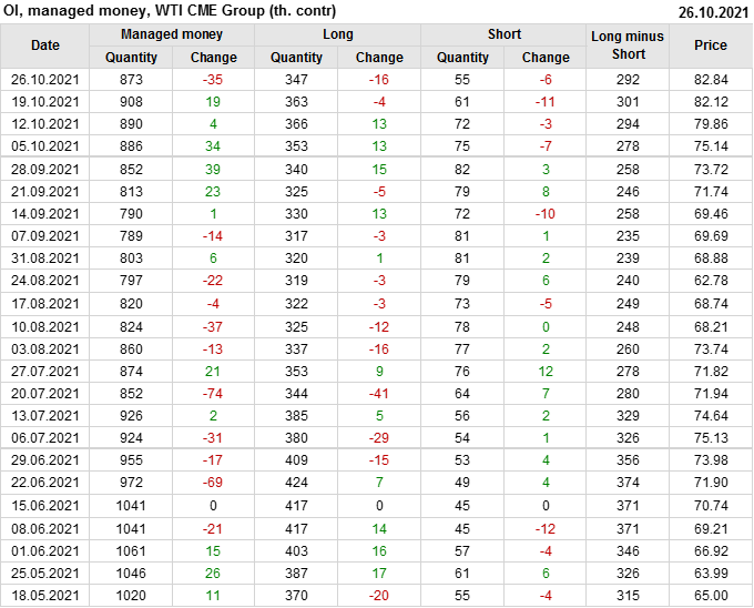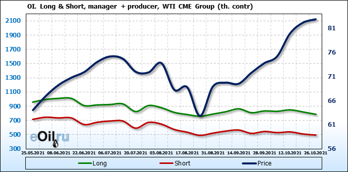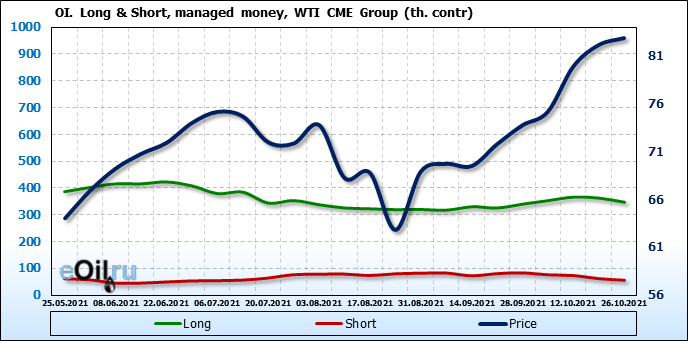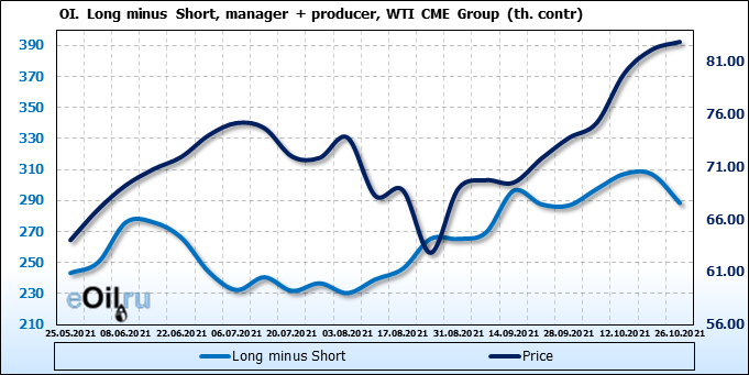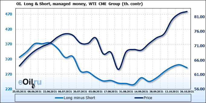 За прошлую неделю, 20.10.21 — 26.10.21, разница между длинными и короткими позициями управляющих сократилась на 9.9 тыс. контрактов. В тоже время, цена выросла на 0.72 доллара.