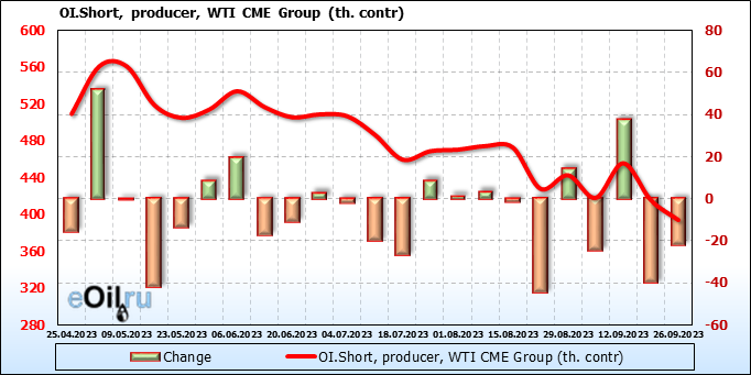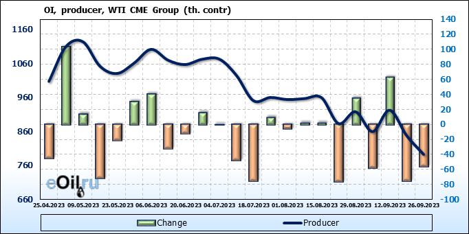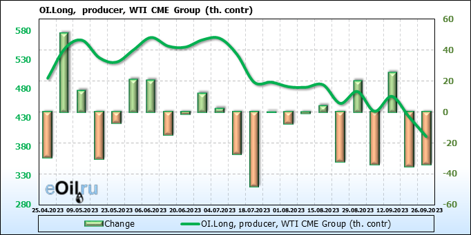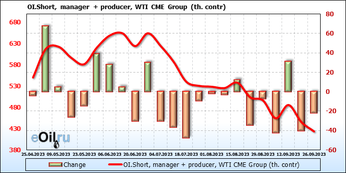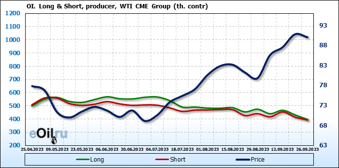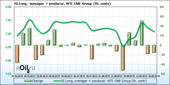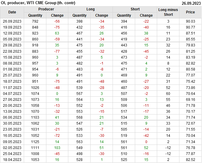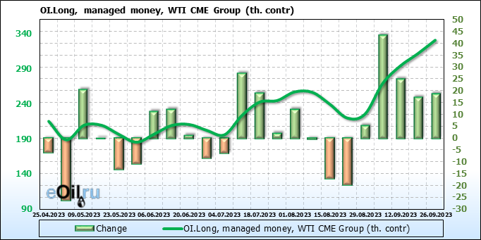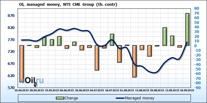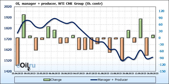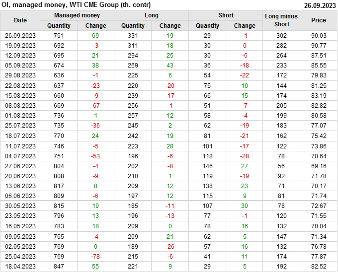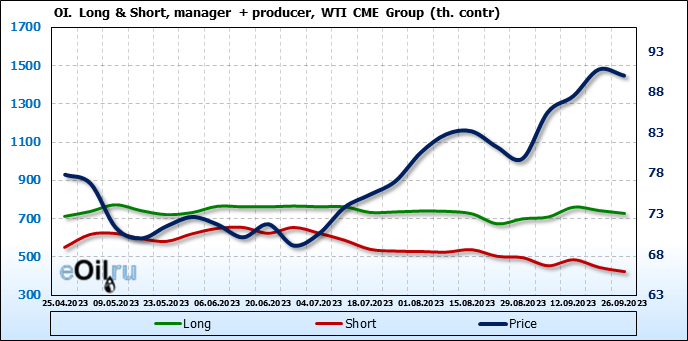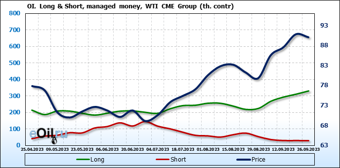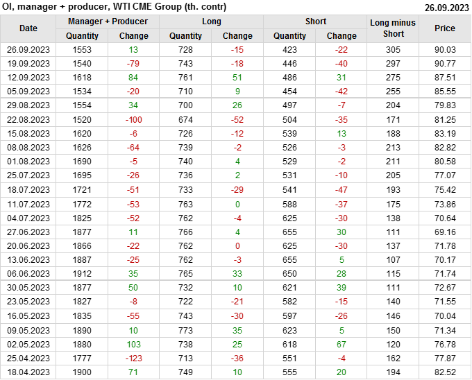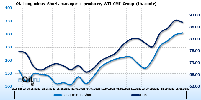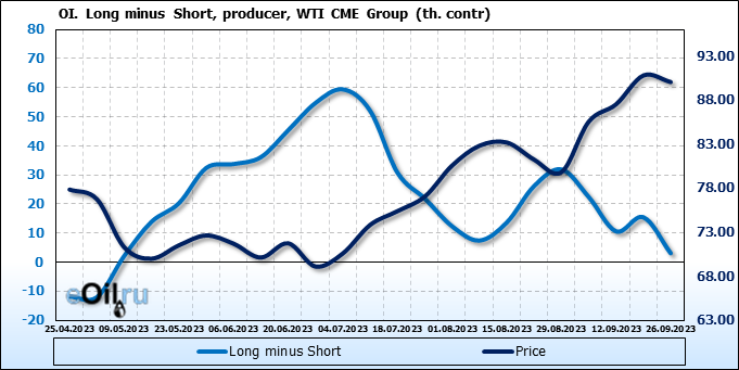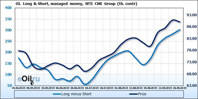 За прошлую неделю, 20.09.23 — 26.09.23, разница между длинными и короткими позициями управляющих увеличилась на 20 тыс. контрактов. В тоже время, цена упала на 0.74 доллара.