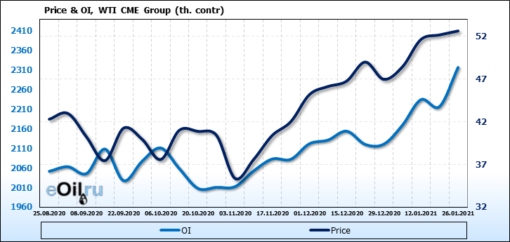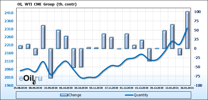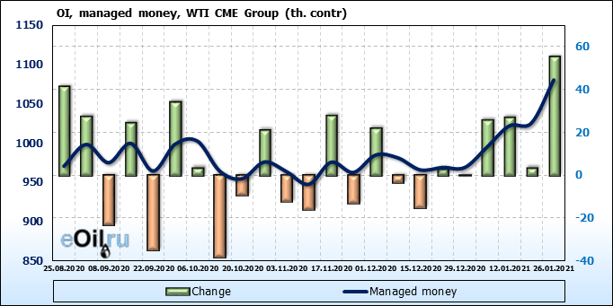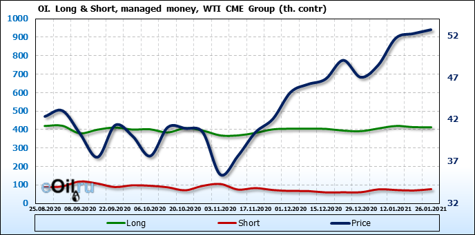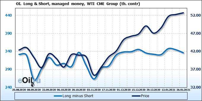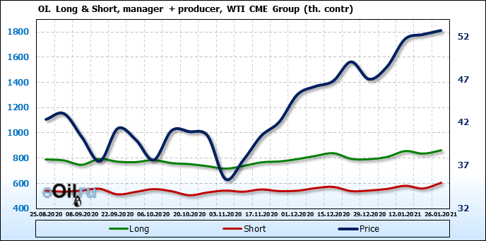 За прошлую неделю, 20.01.21 — 26.01.21, разница между длинными и короткими позициями управляющих упала на 8 тыс. контрактов. В тоже время, цена выросла на 0.46 доллара. Управляющие не горят желанием покупать, что заставляет нас рассуждать о потери доверия к тенденции со стороны быков — спекулянтов. Рынок становится более тонким. Без прихода свежих объемов, толкать цену вверх скоро будет некому.