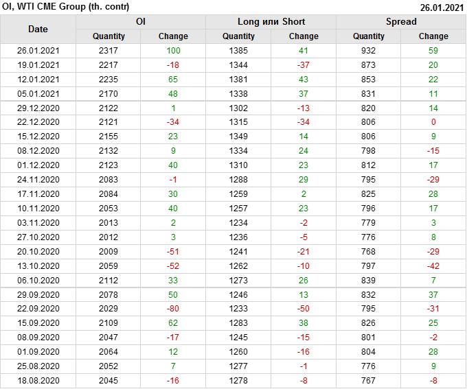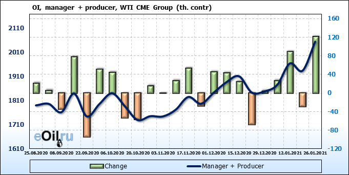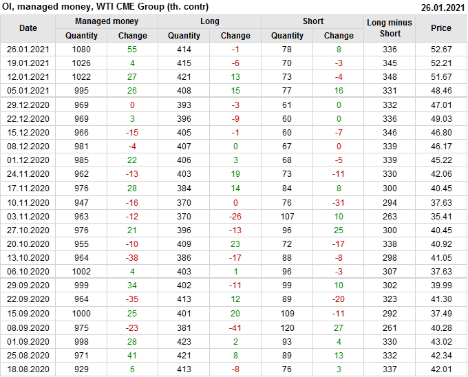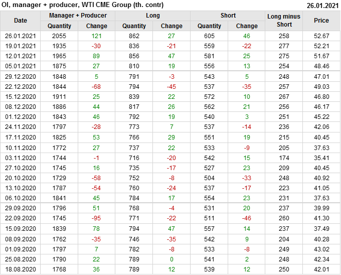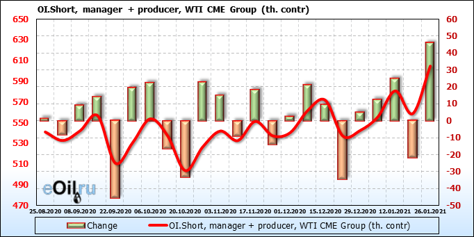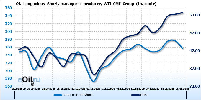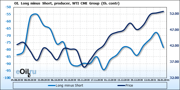 За прошлую неделю, 20.01.21 — 26.01.21, разница между длинными и короткими позициями производителей и управляющих упала на 19 тыс. контрактов. За отчетный период времени, цена выросла на 0.46 доллара. Разница совокупного объема длинных и коротких позиций производителей и управляющих на прошедшей неделе снизилась, в то время как цены выросли. Рынок теряет доверие покупателей, что, при продолжении данной динамики, приведет к стабилизации или падению цен в ближайшее время.