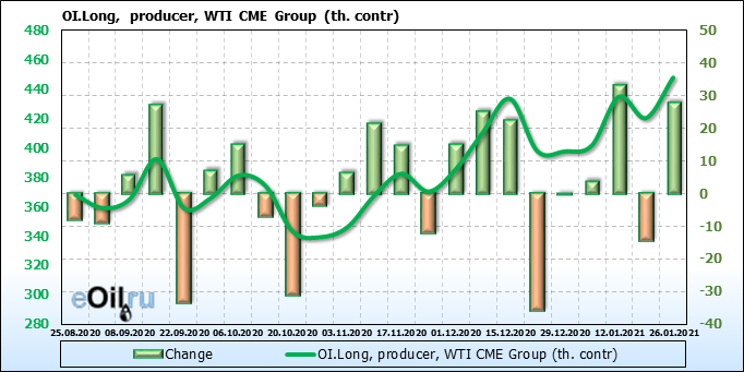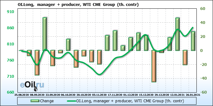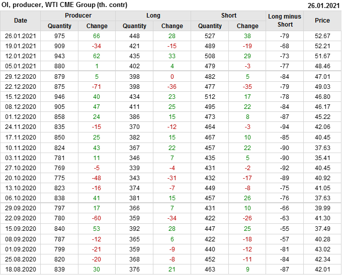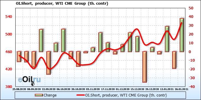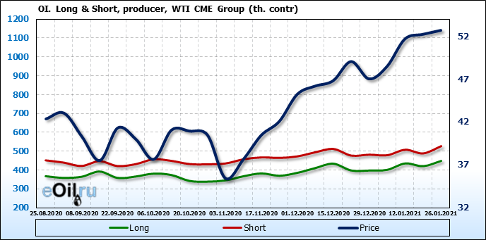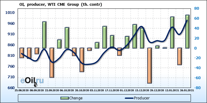 За прошлую неделю, 20.01.21 — 26.01.21, разница между длинными и короткими позициями производителей упала на 11 тыс. контрактов. В тоже время, цена выросла на 0.46 доллара. Производители увеличивают продажи, предполагая, что текущие уровни являются привлекательными для них. И не смотря на это, рынок продолжает расти, что показывает силу текущего тренда.