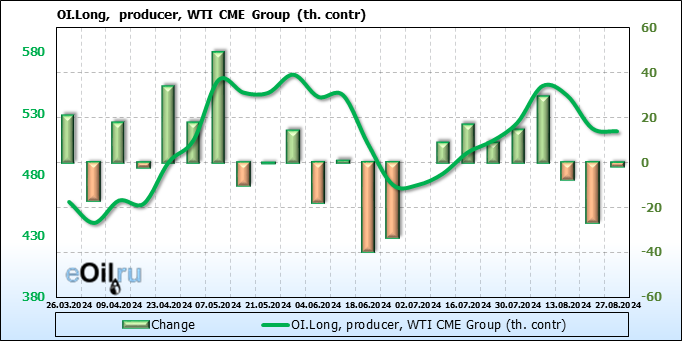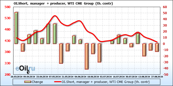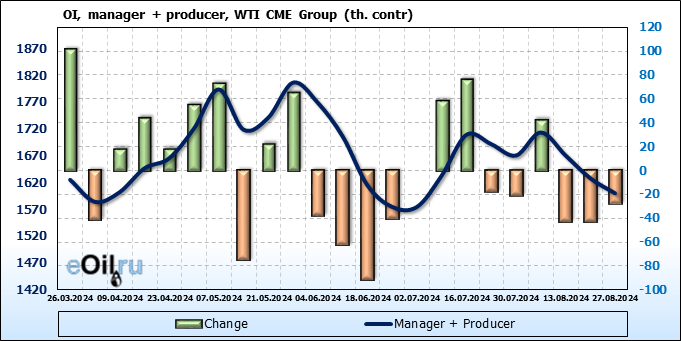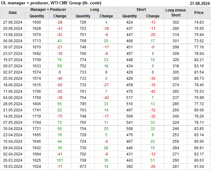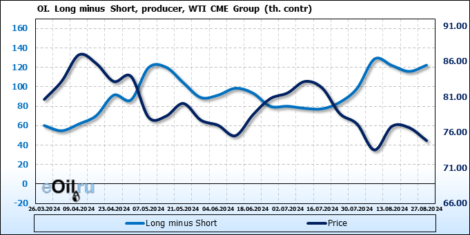 За прошлую неделю, 21.08.24 — 27.08.24, разница между длинными и короткими позициями управляющих увеличилась на 10.1 тыс. контрактов. В тоже время, цена упала на 1.82 доллара.
