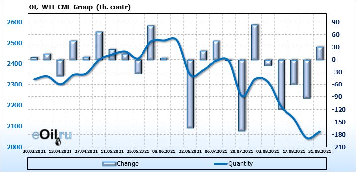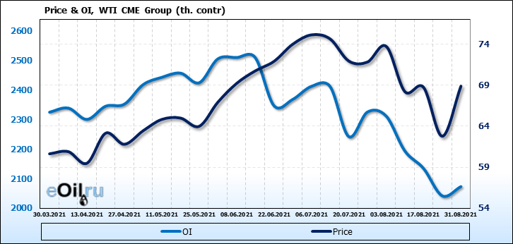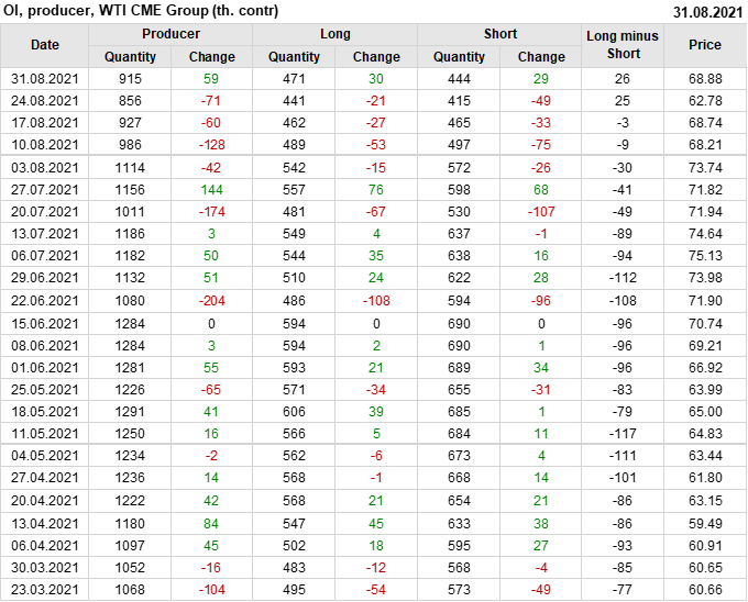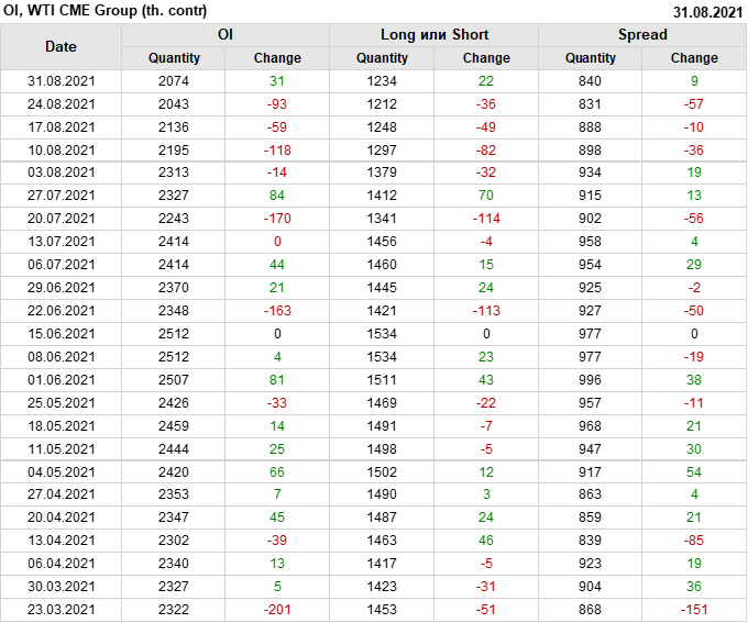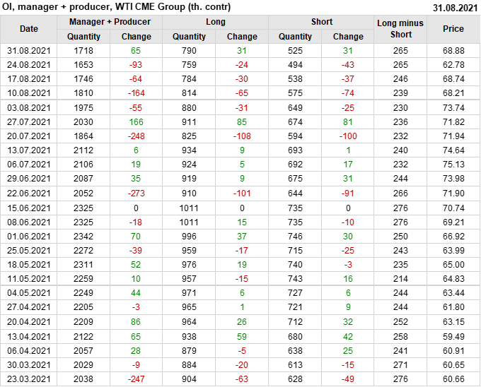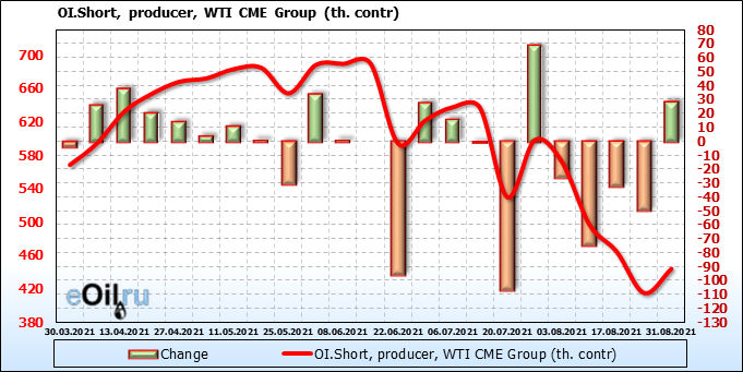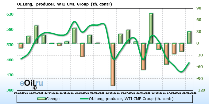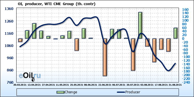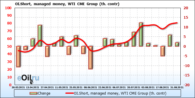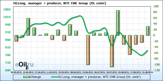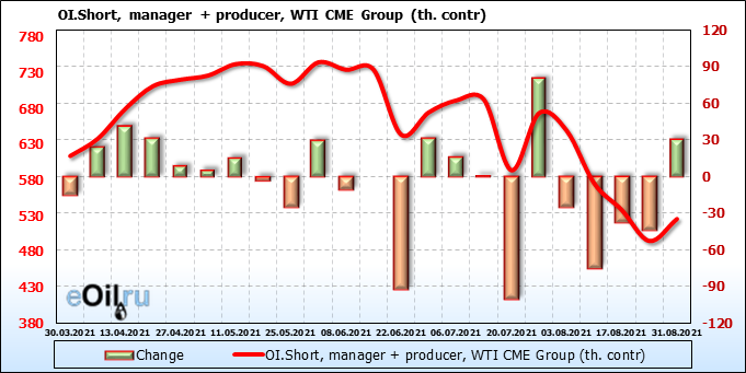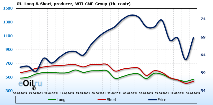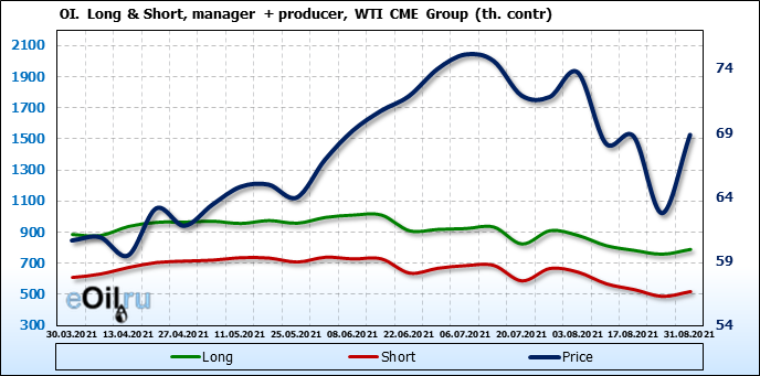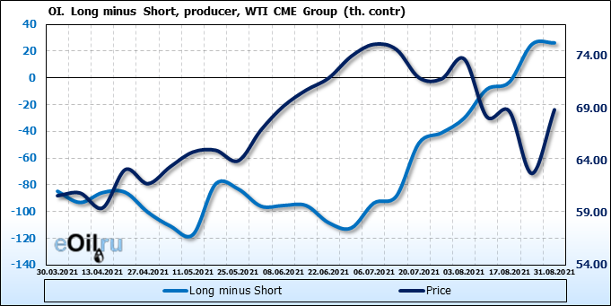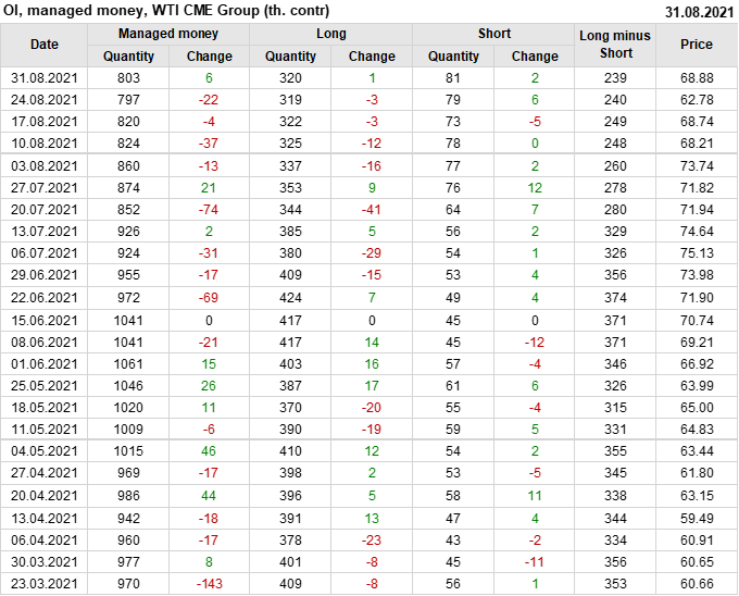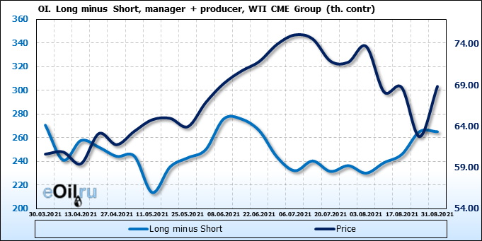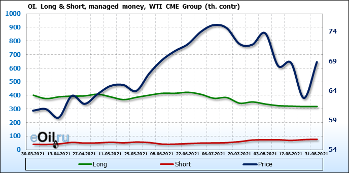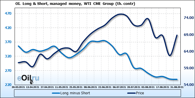 За прошлую неделю, 25.08.21 — 31.08.21, разница между длинными и короткими позициями управляющих сократилась на 1.2 тыс. контрактов. В тоже время, цена выросла на 6.1 доллара.