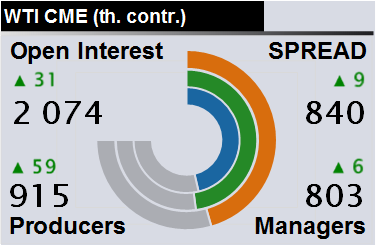 За прошлую неделю разница между OI производителей и OI управляющих выросла на 30 841 контракт. Разница между длинными позициями производителей и управляющих выросла на 74 470 контрактов. Разница между короткими позициями производителей и управляющих сократилась на 19 379 контрактов.