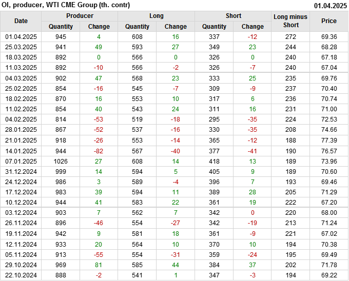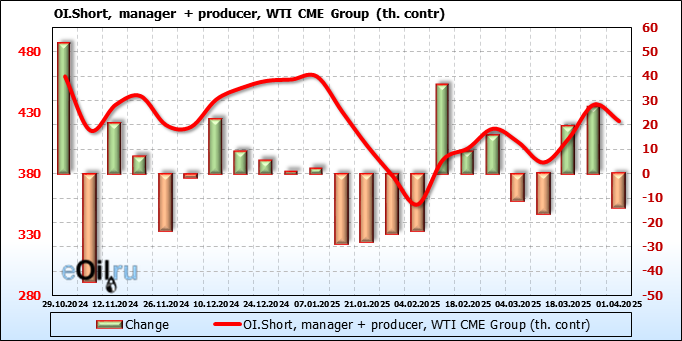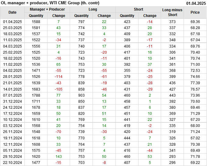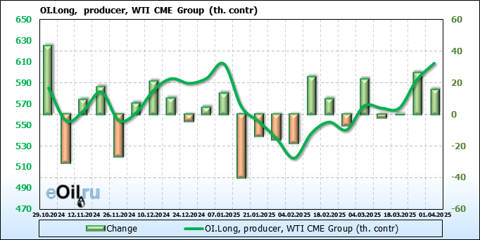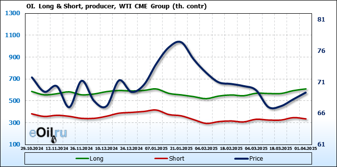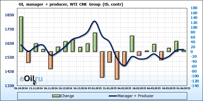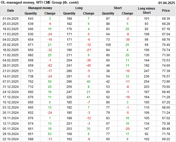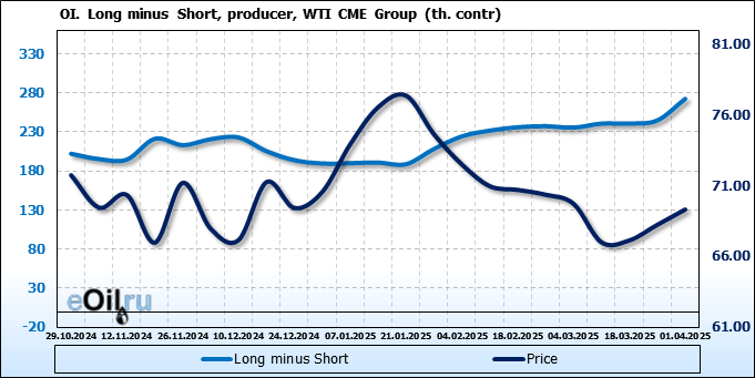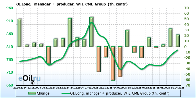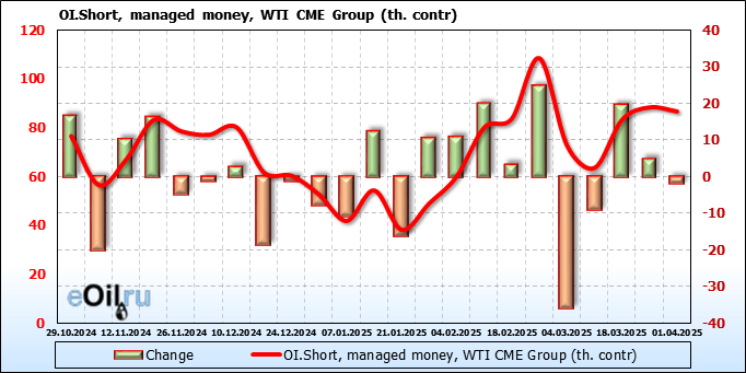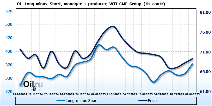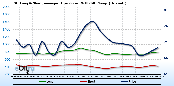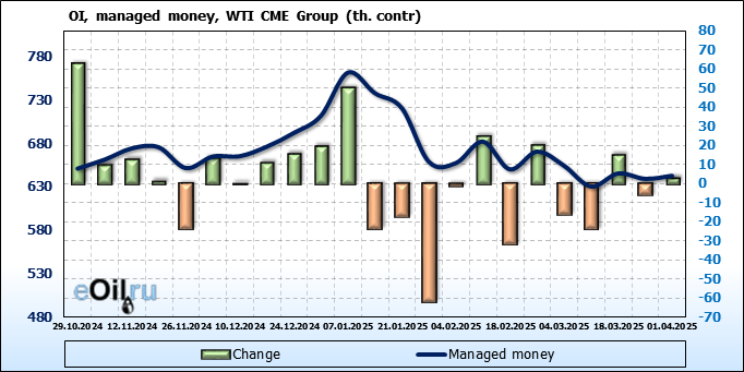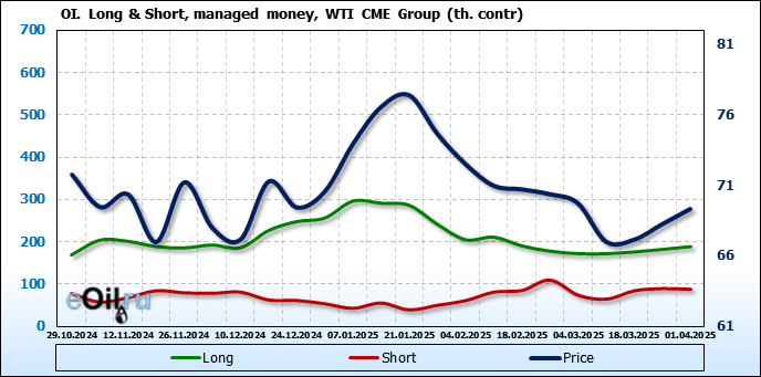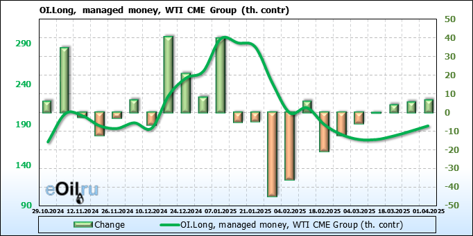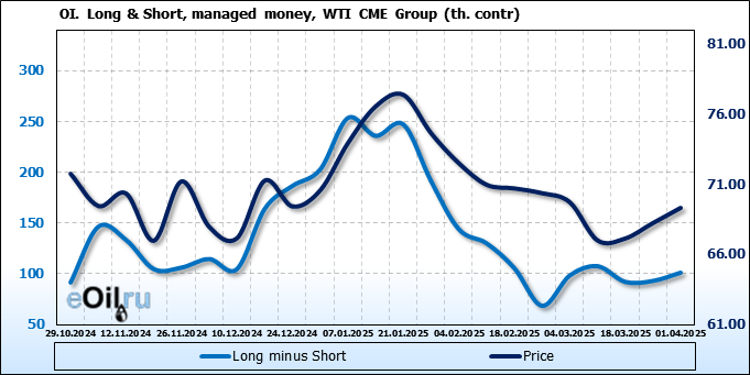 За прошлую неделю, 26.03.25 — 01.04.25, разница между длинными и короткими позициями управляющих увеличилась на 8.2 тыс. контрактов. В тоже время, цена выросла на 1.08 доллара.