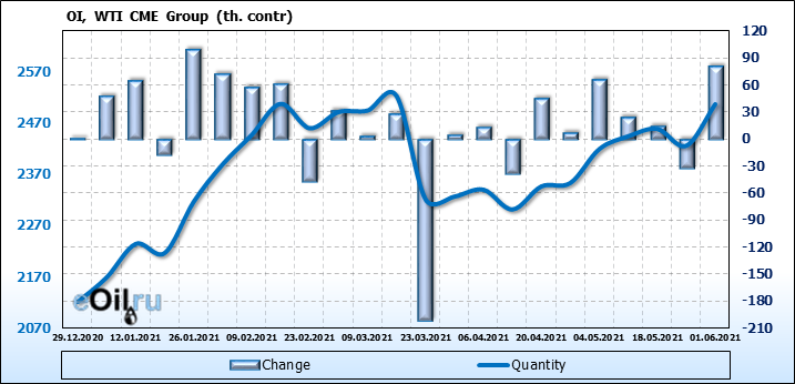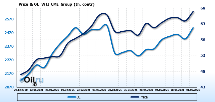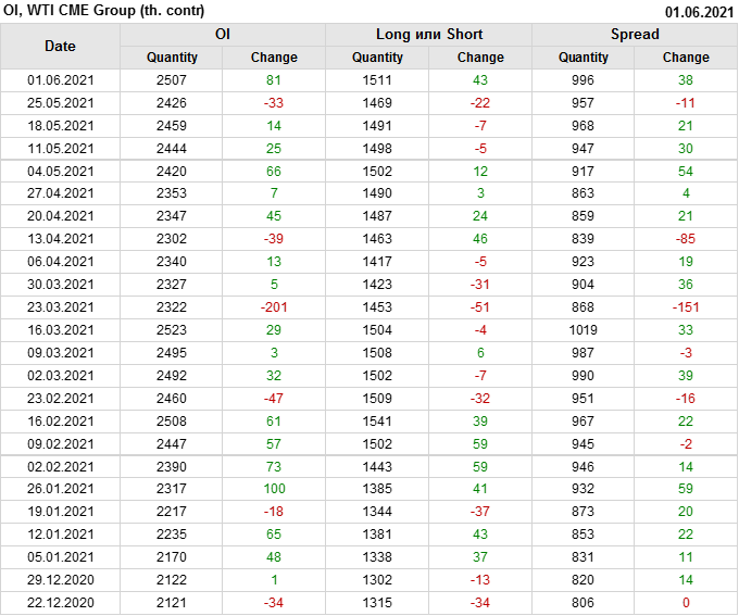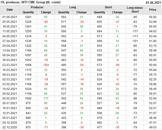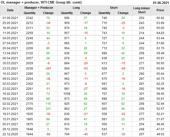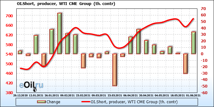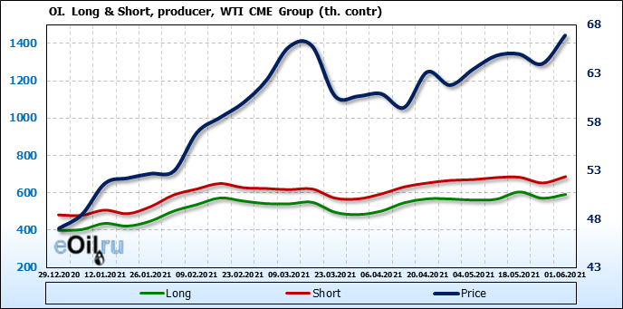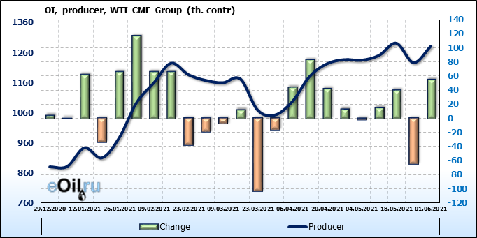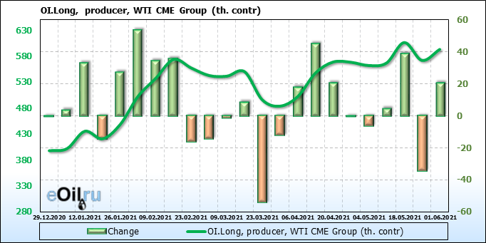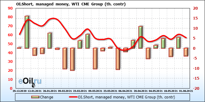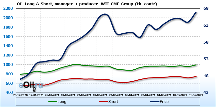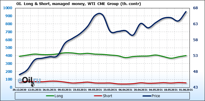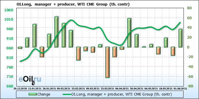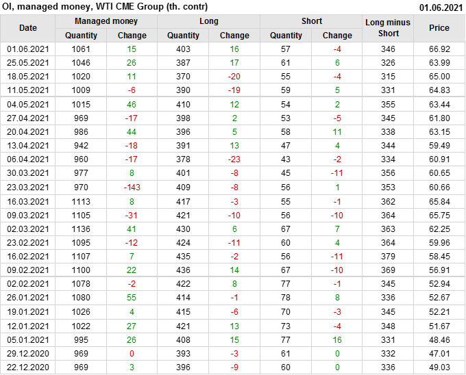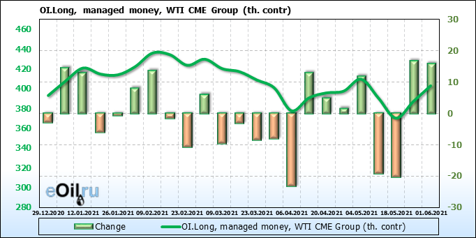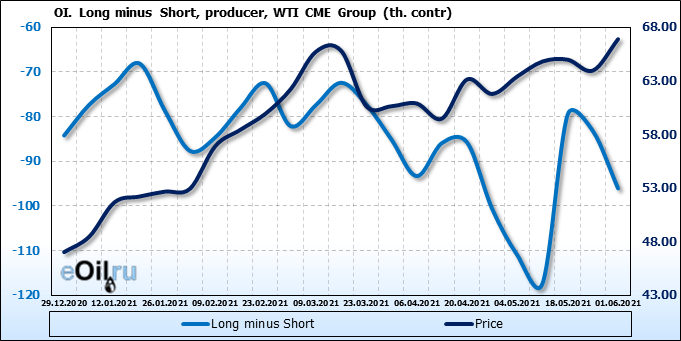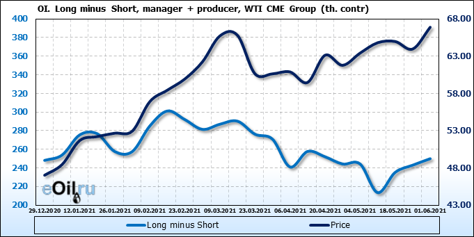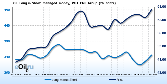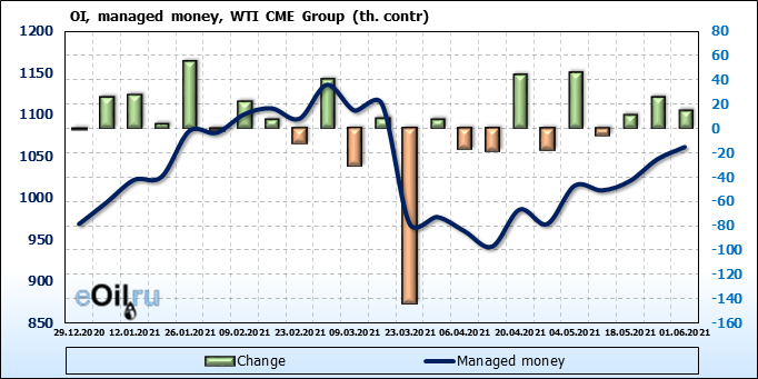 За прошлую неделю, 26.05.21 — 01.06.21, разница между длинными и короткими позициями управляющих увеличилась на 19.8 тыс. контрактов. В тоже время, цена выросла на 2.93 доллара.