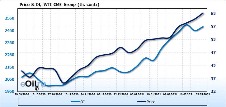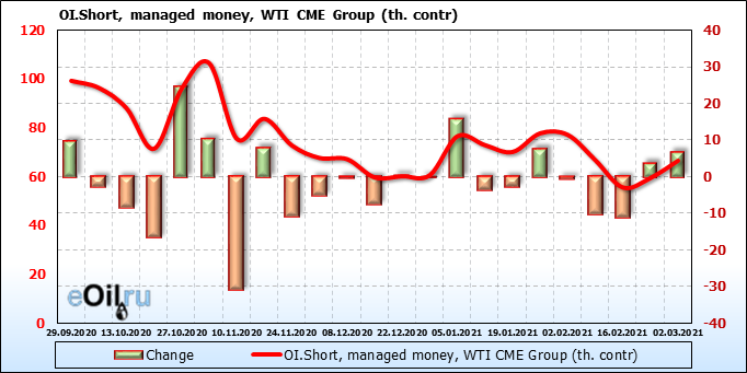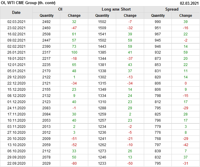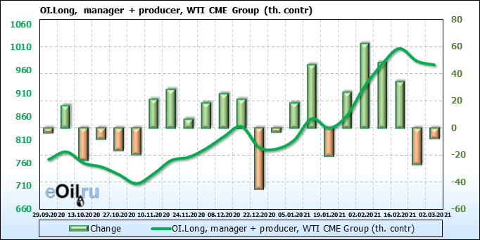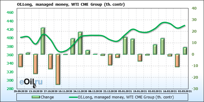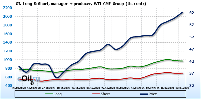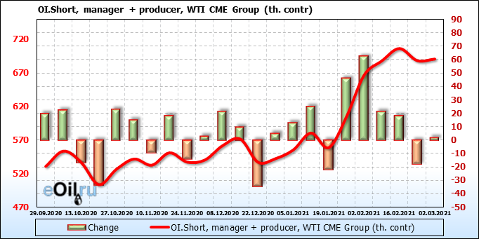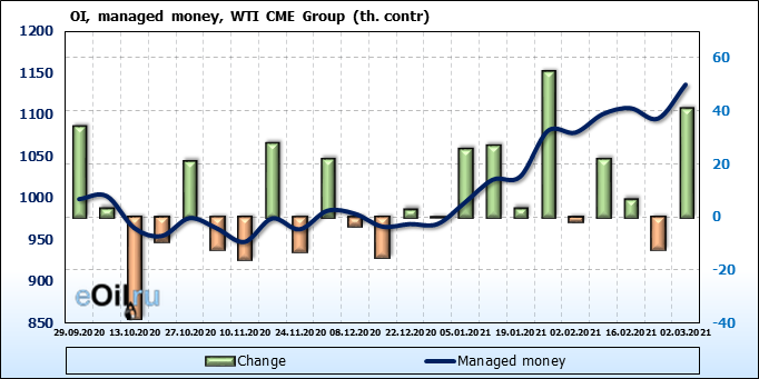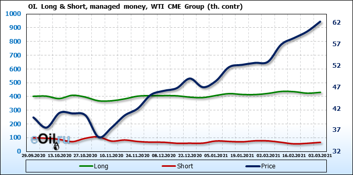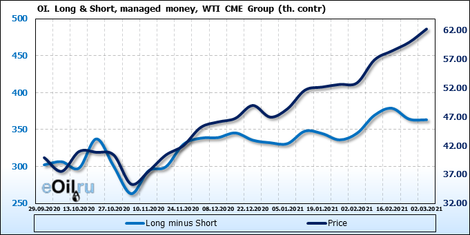 За прошлую неделю, 24.02.21 — 02.03.21, разница между длинными и короткими позициями управляющих упала на 1 тыс. контрактов. В тоже время, цена выросла на 2.29 доллара. Управляющие не горят желанием покупать, что заставляет нас рассуждать о потери доверия к тенденции со стороны быков — спекулянтов. Рынок становится более тонким. Без прихода свежих объемов, толкать цену вверх скоро будет некому.