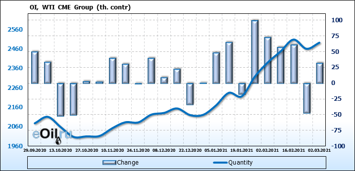 За прошлую неделю, 24.02.21 — 02.03.21, открытый интерес вырос на 32 тыс. контрактов. Объем вовлеченных в торговлю контрактов составляет 2 491 831 штуку. Текущее положение дел на рынке таково, что деньги в течение прошлой недели приходили на рынок поддерживая тенденцию.