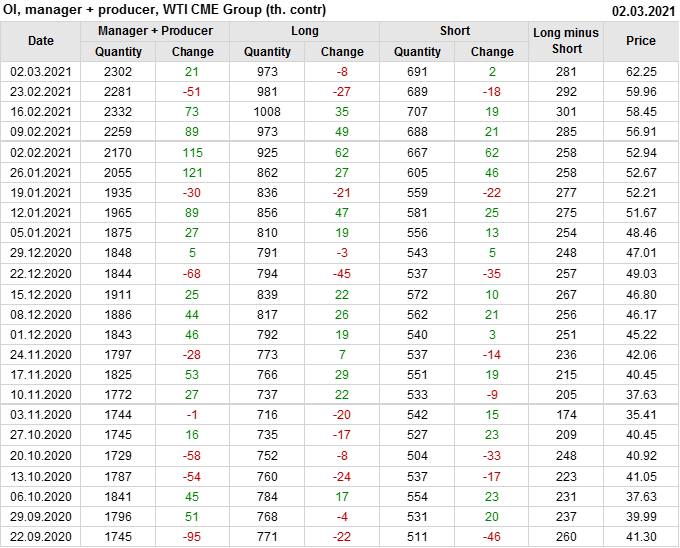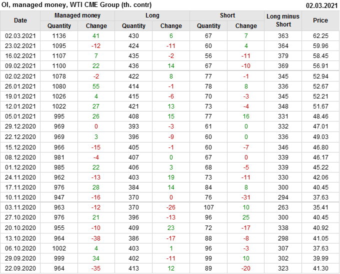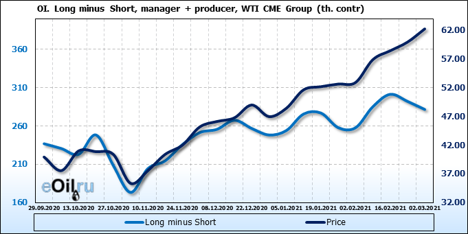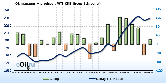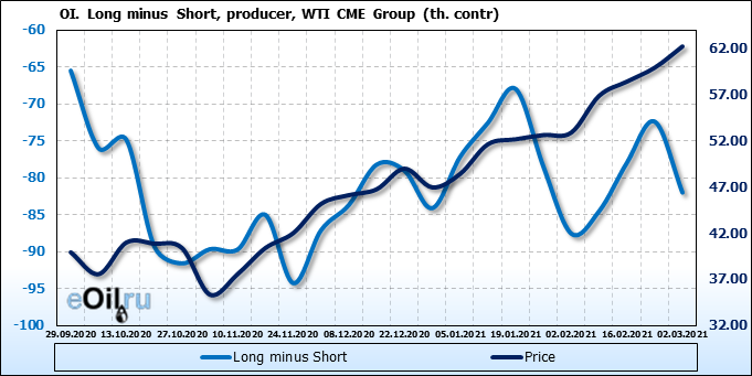 За прошлую неделю, 24.02.21 — 02.03.21, разница между длинными и короткими позициями производителей и управляющих упала на 10 тыс. контрактов. За отчетный период времени, цена выросла на 2.29 доллара. Разница совокупного объема длинных и коротких позиций производителей и управляющих на прошедшей неделе снизилась, в то время как цены выросли. Рынок теряет доверие покупателей, что, при продолжении данной динамики, приведет к стабилизации или падению цен в ближайшее время.