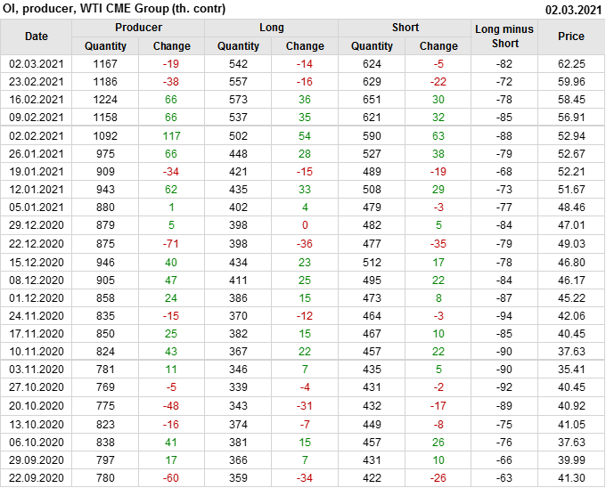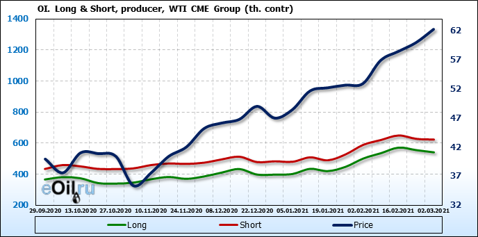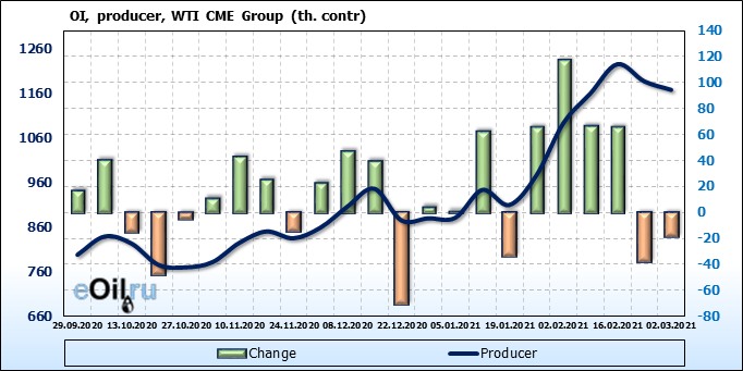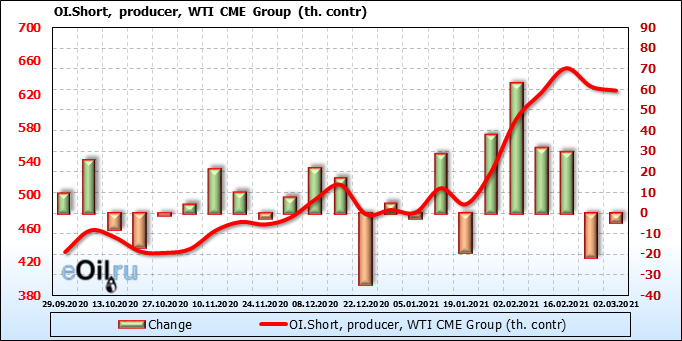 За прошлую неделю, 24.02.21 — 02.03.21, разница между длинными и короткими позициями производителей упала на 10 тыс. контрактов. В тоже время, цена выросла на 2.29 доллара. Производители увеличивают продажи, предполагая, что текущие уровни являются привлекательными для них. И не смотря на это, рынок продолжает расти, что показывает силу текущего тренда.