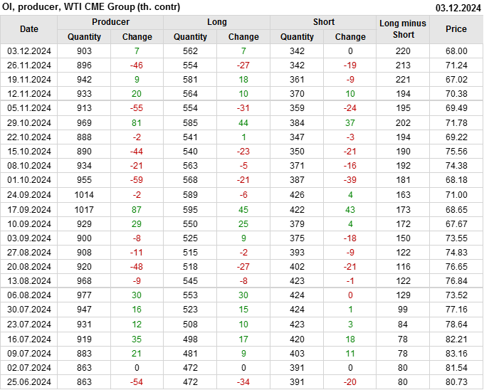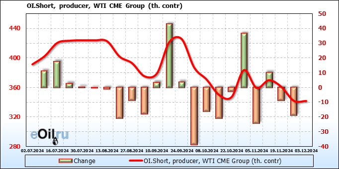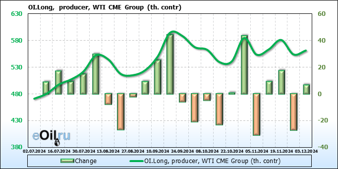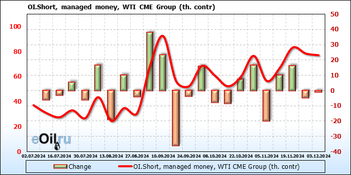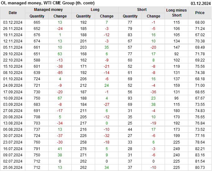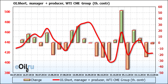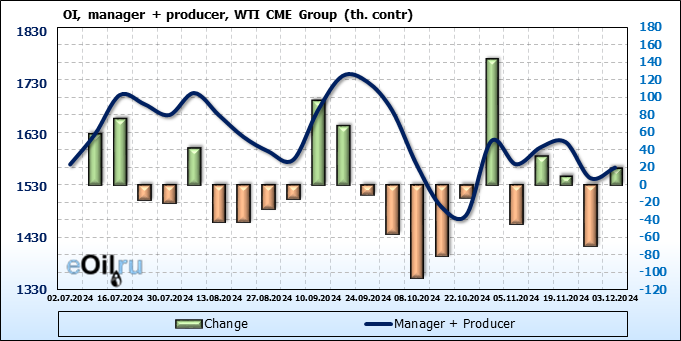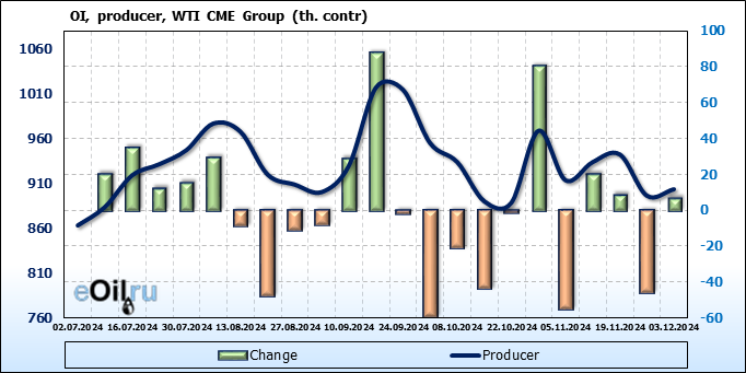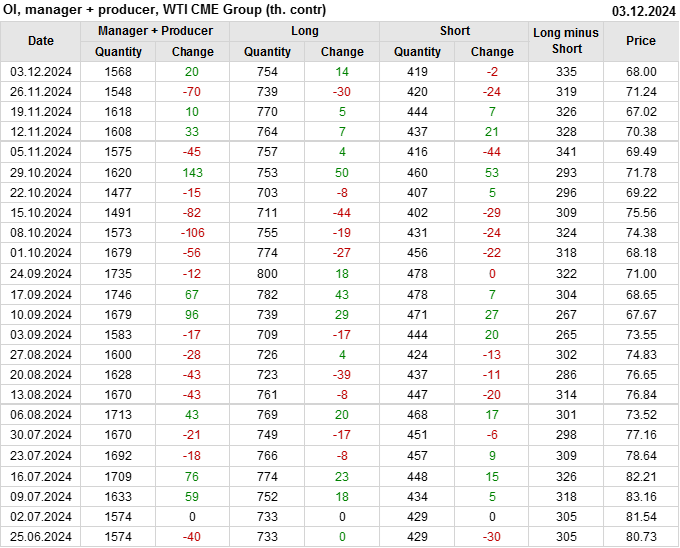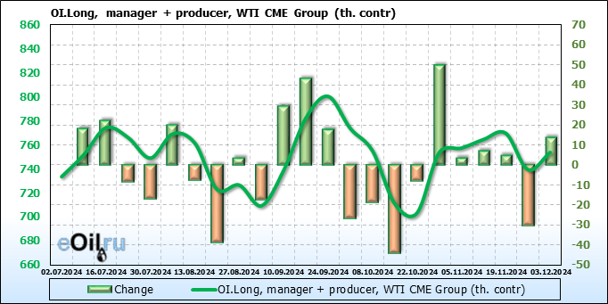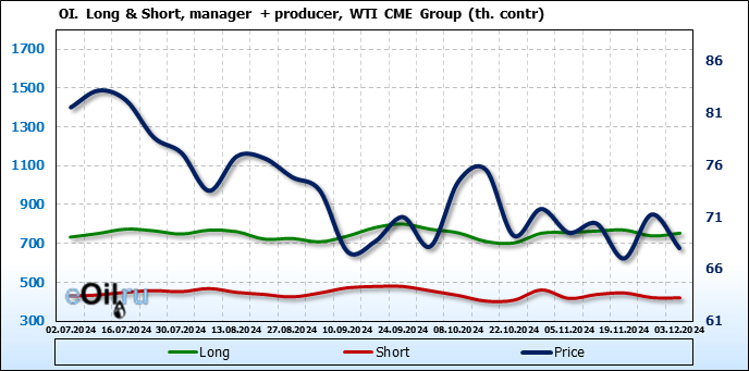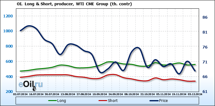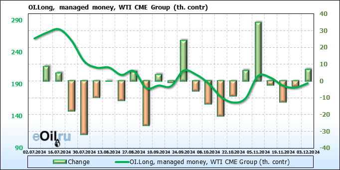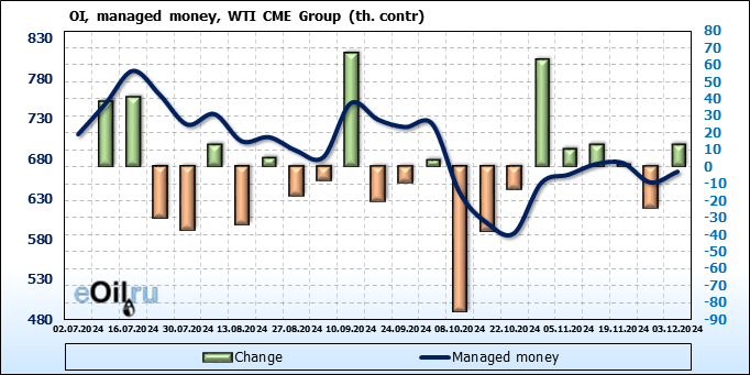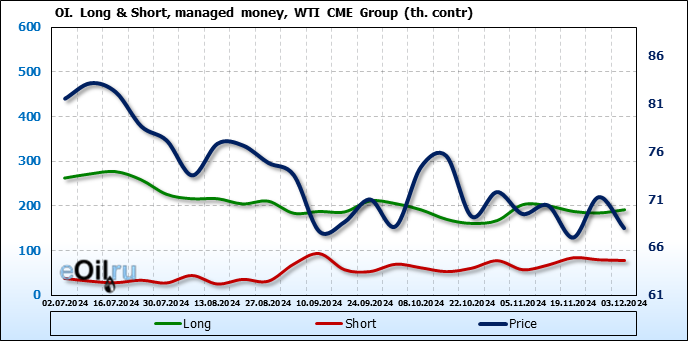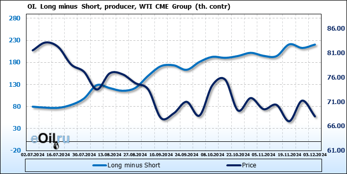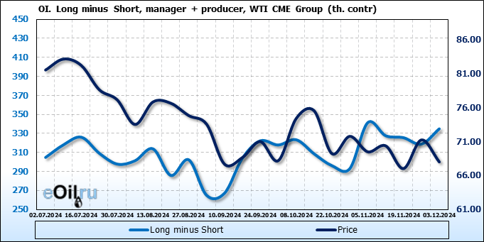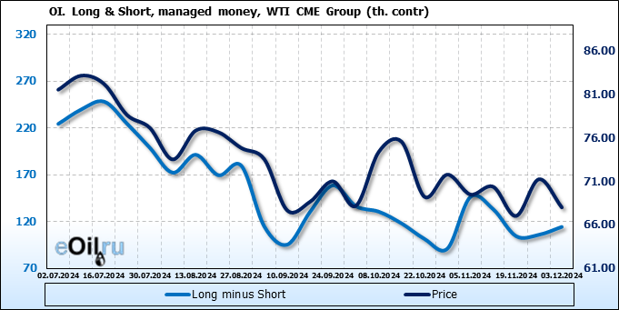 За прошлую неделю, 27.11.24 — 03.12.24, разница между длинными и короткими позициями управляющих увеличилась на 8.4 тыс. контрактов. В тоже время, цена упала на 3.24 доллара.