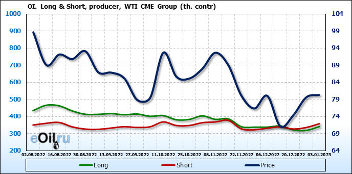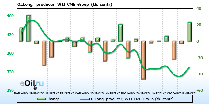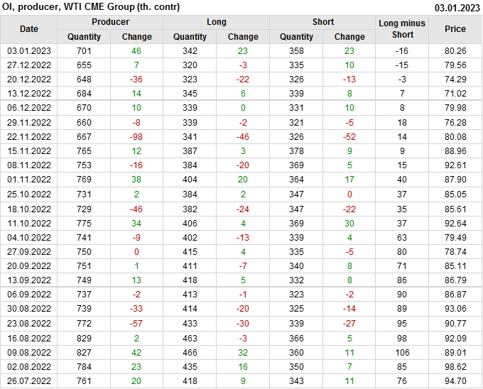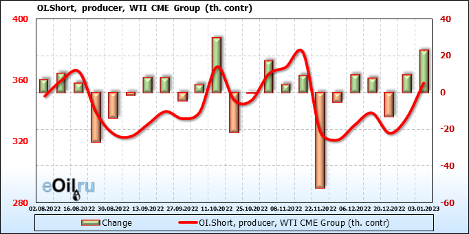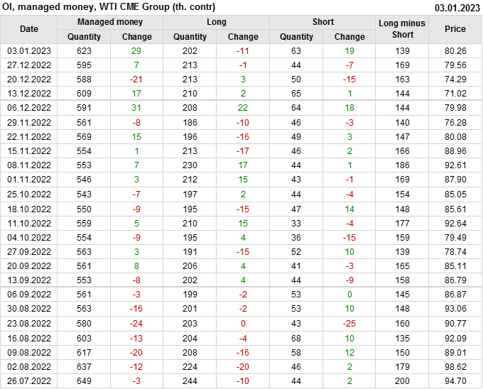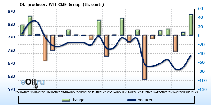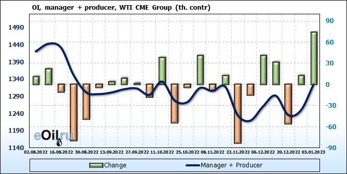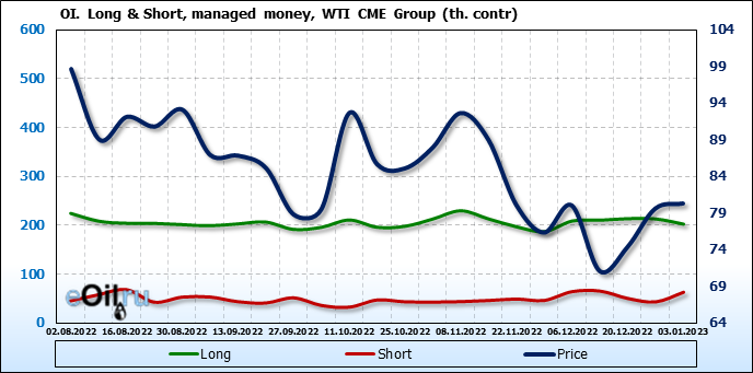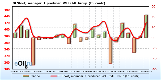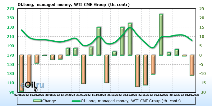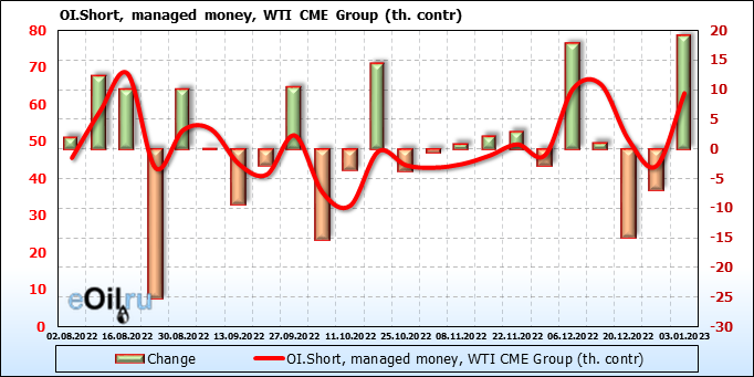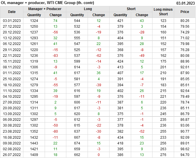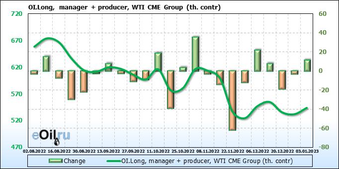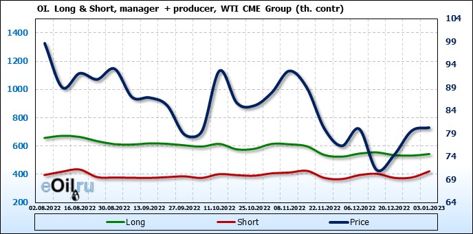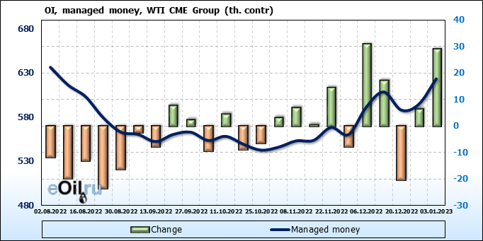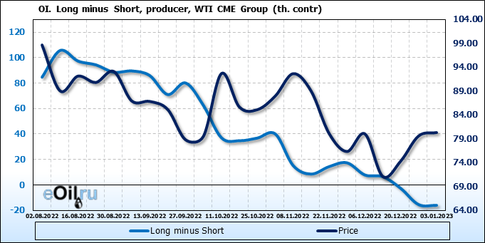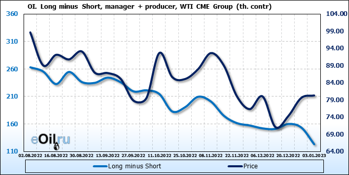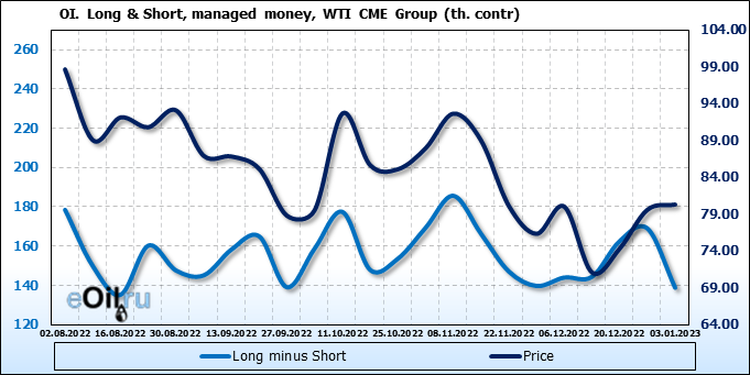 За прошлую неделю, 28.12.22 — 03.01.23, разница между длинными и короткими позициями управляющих сократилась на 30.2 тыс. контрактов. В тоже время, цена выросла на 0.7 доллара.