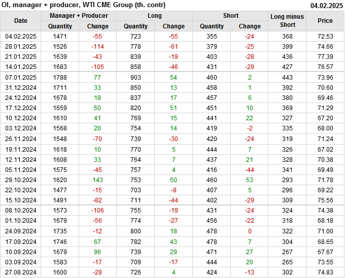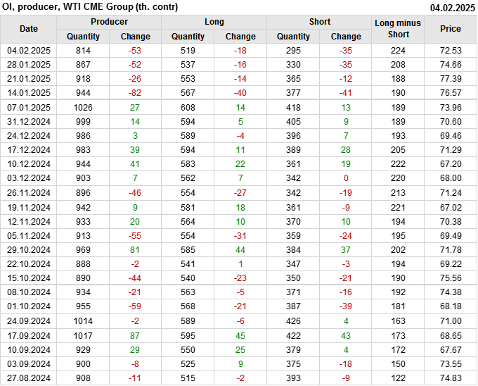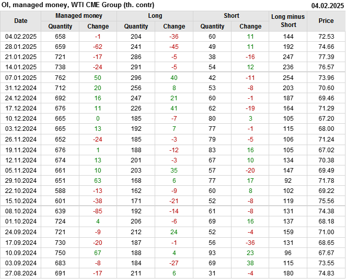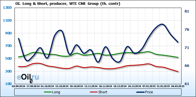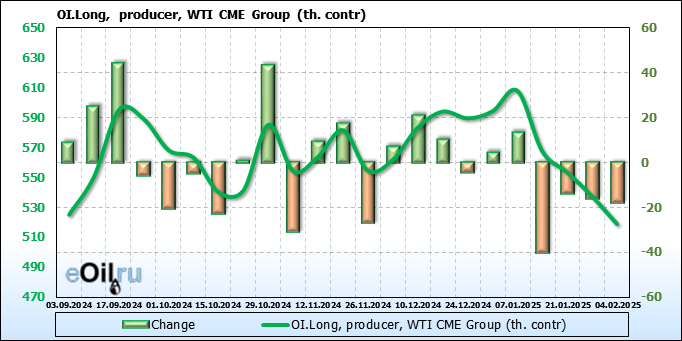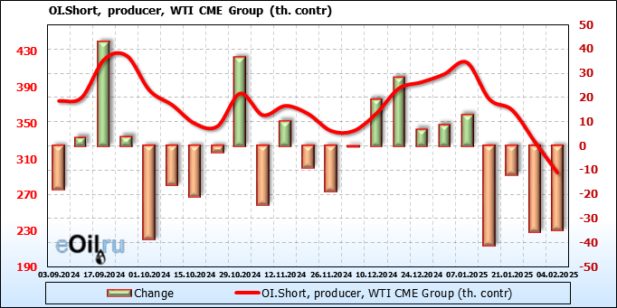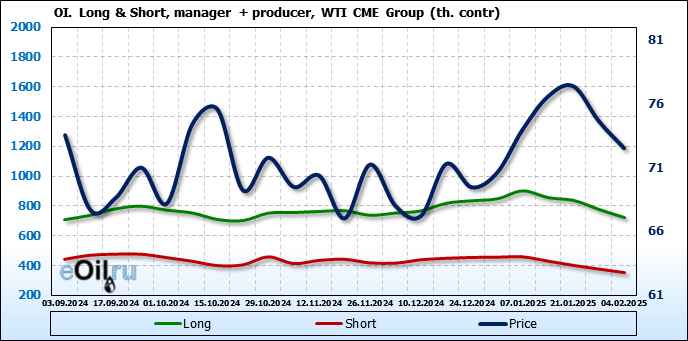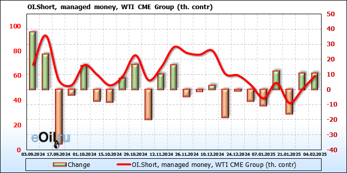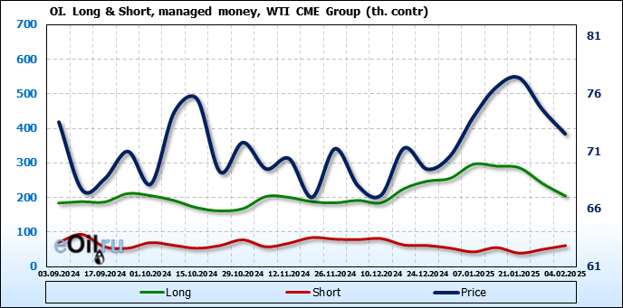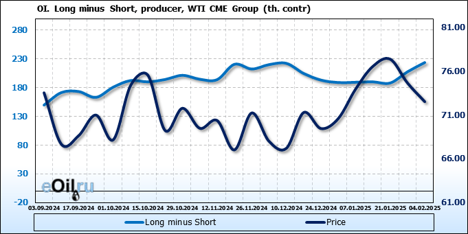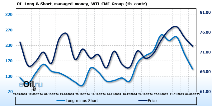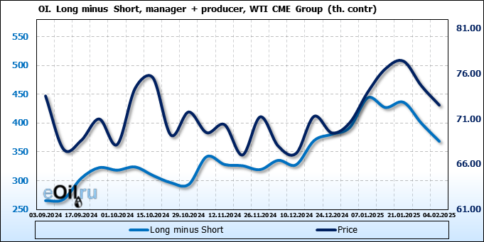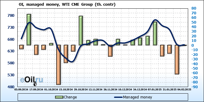 За прошлую неделю, 29.01.25 — 04.02.25, разница между длинными и короткими позициями управляющих сократилась на 47.4 тыс. контрактов. В тоже время, цена упала на 2.13 доллара.