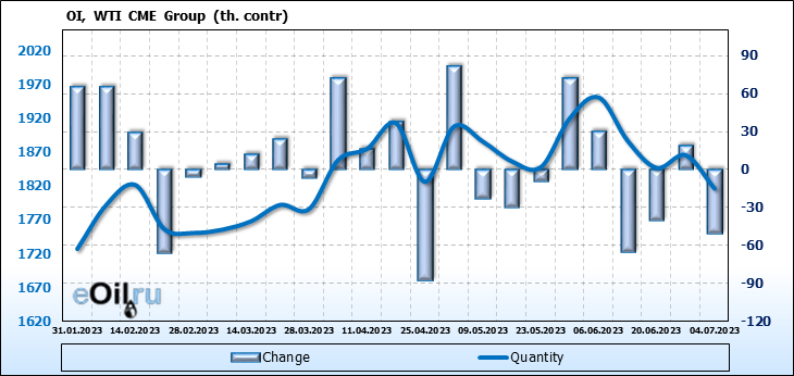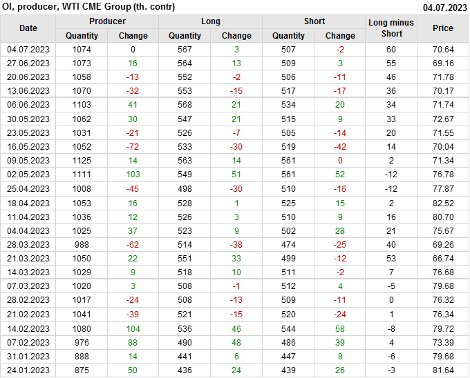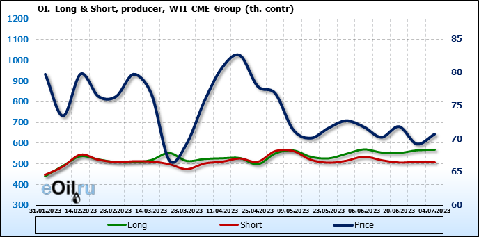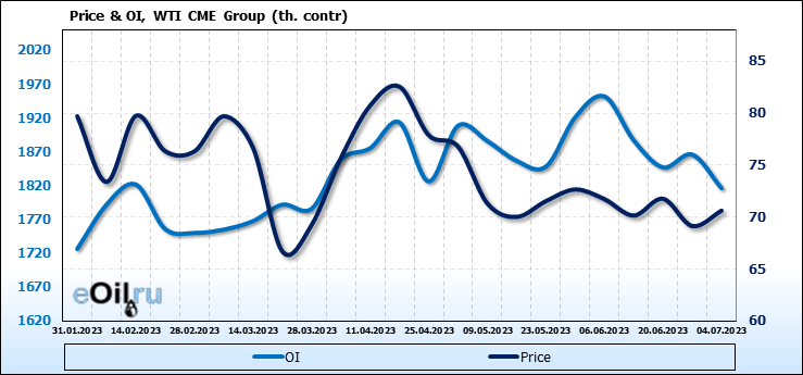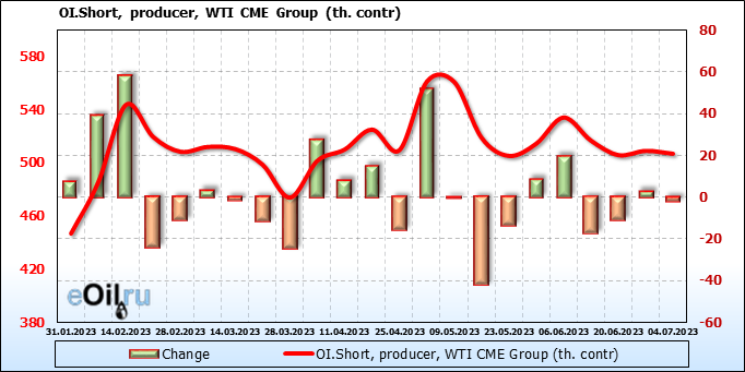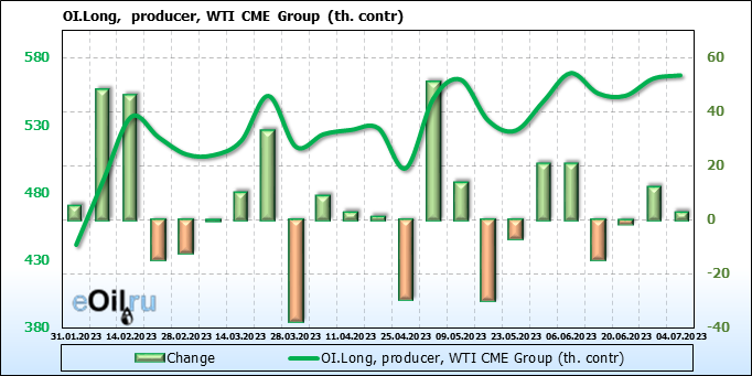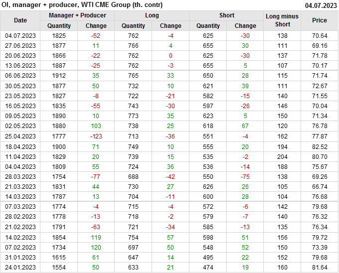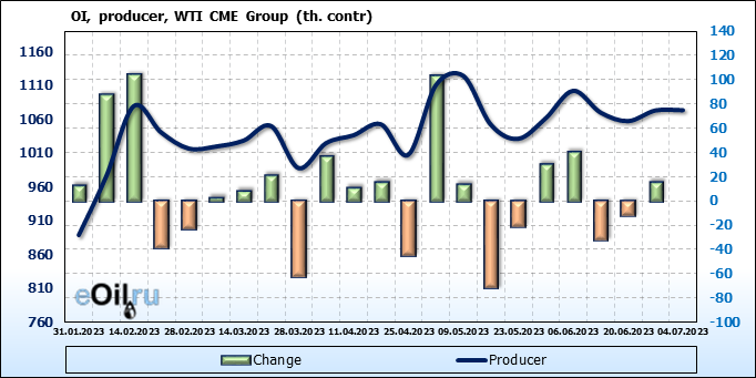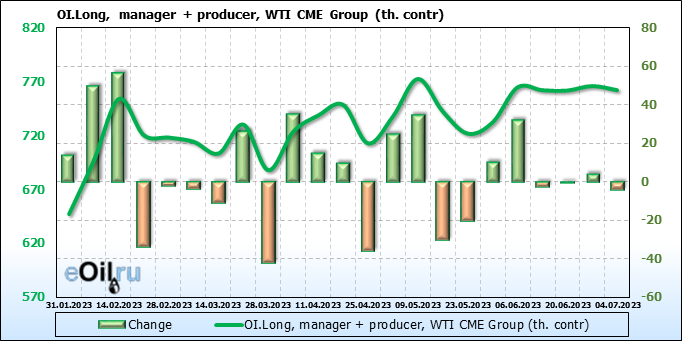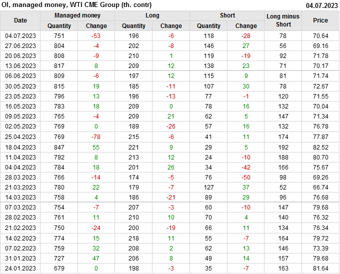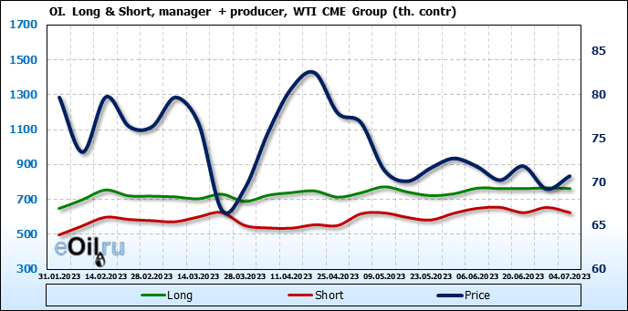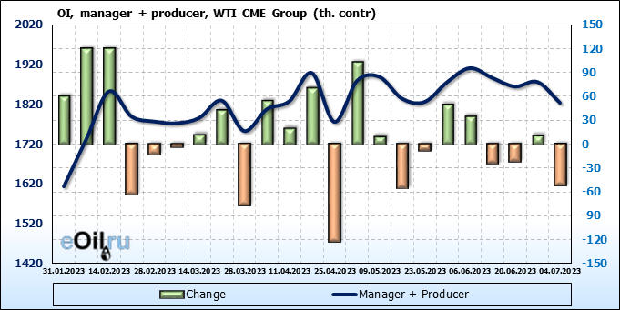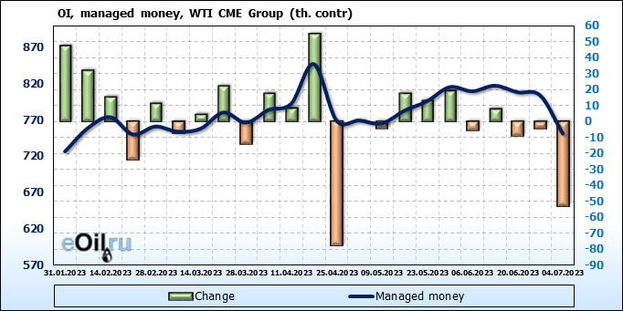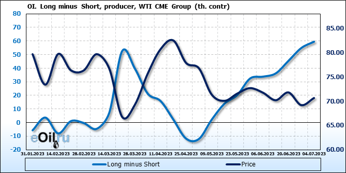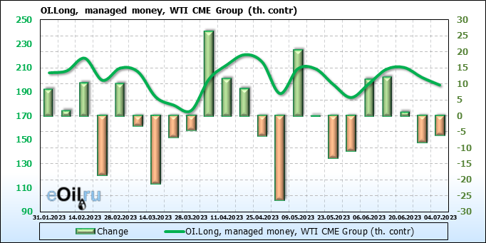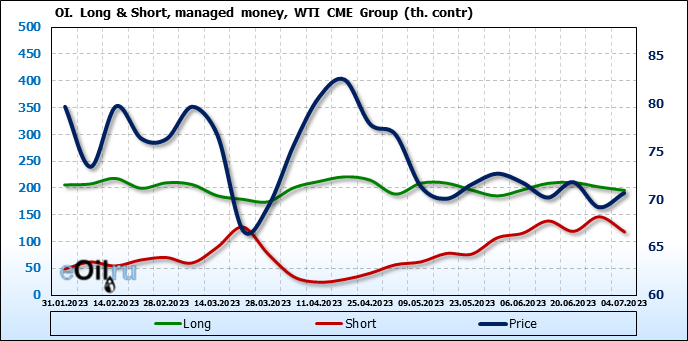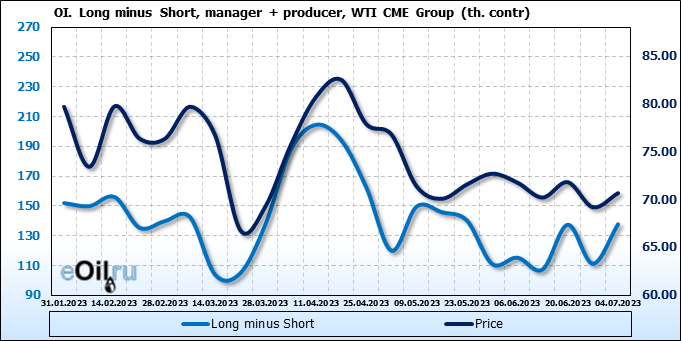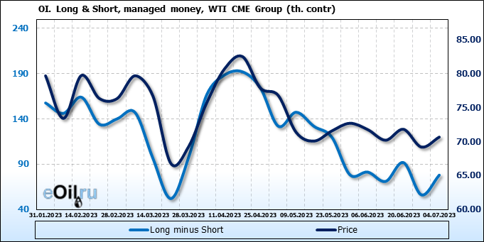 За прошлую неделю, 28.06.23 — 04.07.23, разница между длинными и короткими позициями управляющих увеличилась на 21.8 тыс. контрактов. В тоже время, цена выросла на 1.48 доллара.