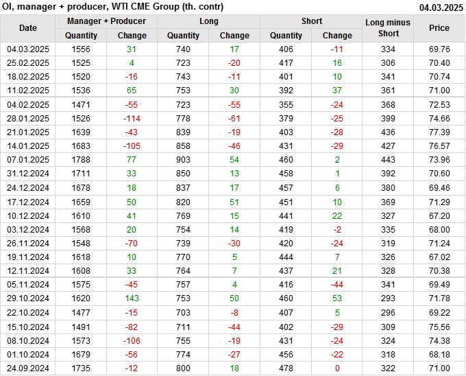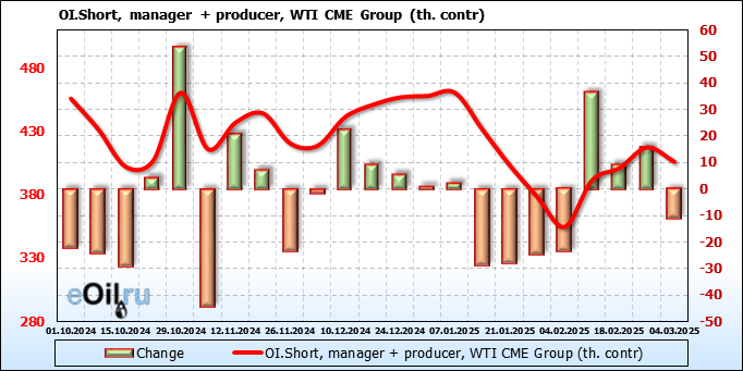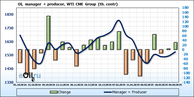 За прошлую неделю, 26.02.25 — 04.03.25, разница между длинными и короткими позициями управляющих увеличилась на 29.9 тыс. контрактов. В тоже время, цена упала на 0.64 доллара.