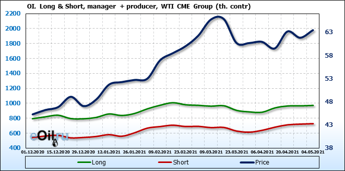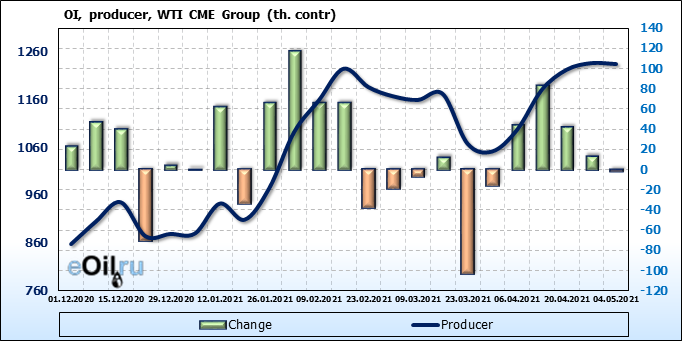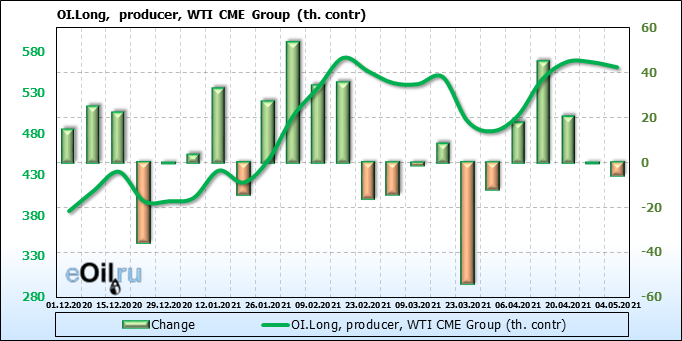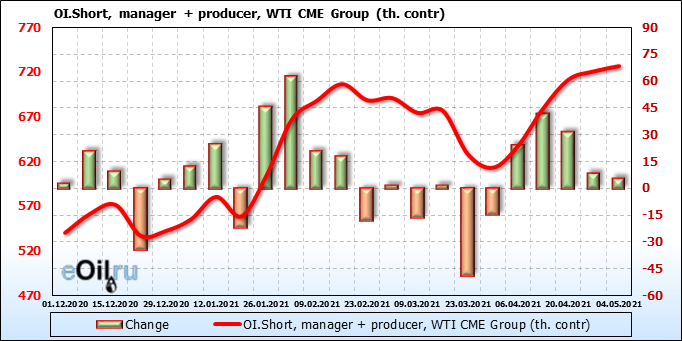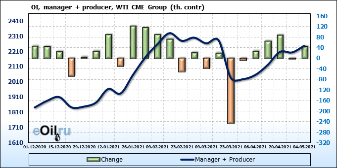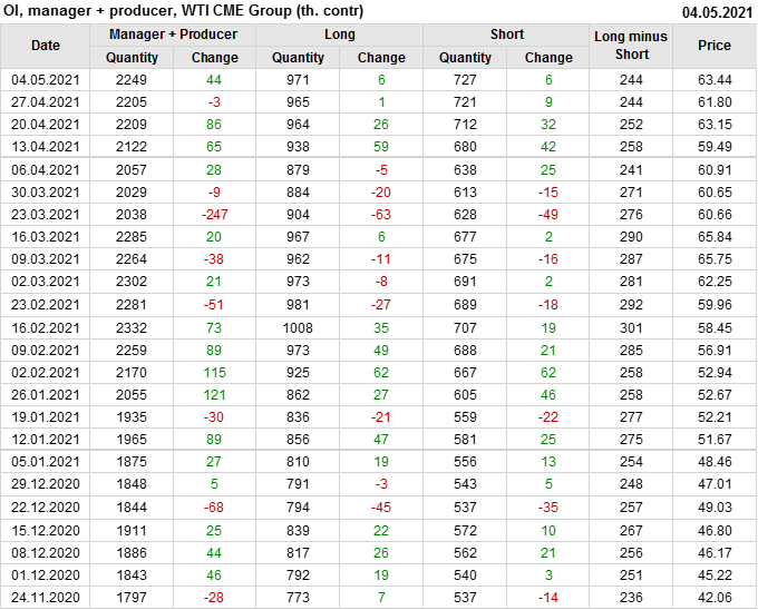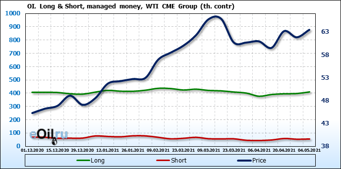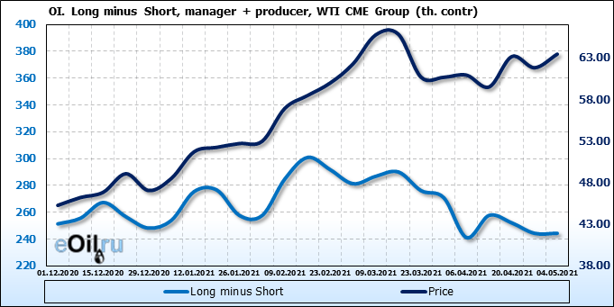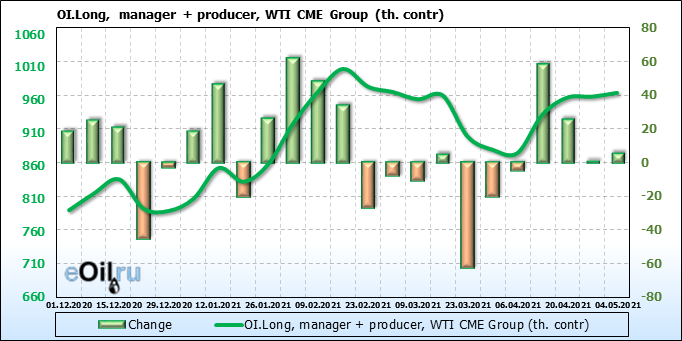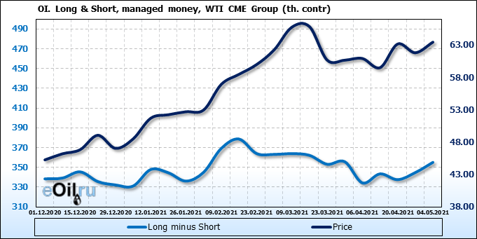 За прошлую неделю, 28.04.21 — 04.05.21, разница между длинными и короткими позициями управляющих выросла на 10.4 тыс. контрактов. В тоже время, цена выросла на 1.64 доллара. Управляющие наращивают позиции, разгоняя тем самым рост цен, что говорит нам о текущей силе рынка.
