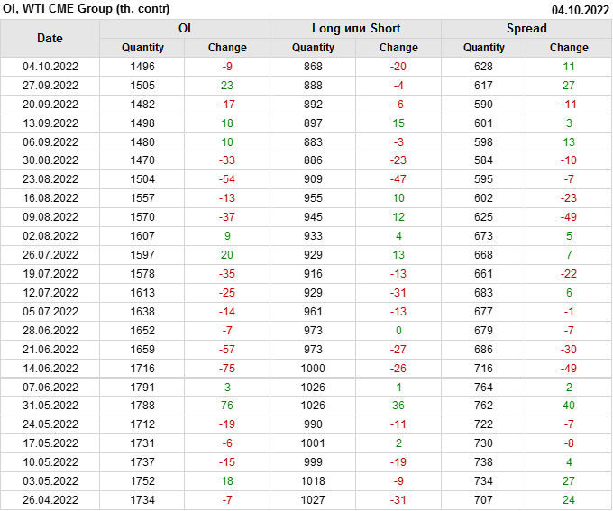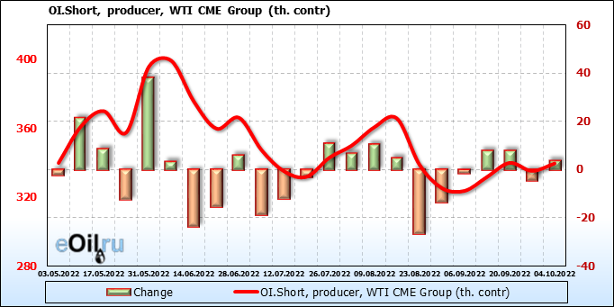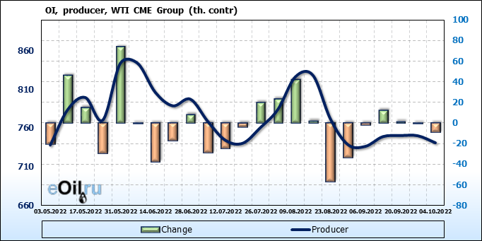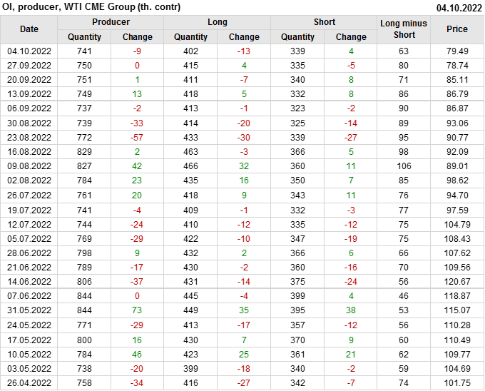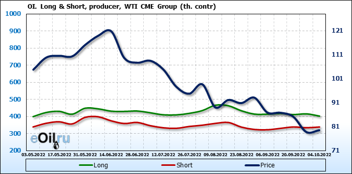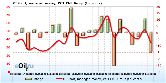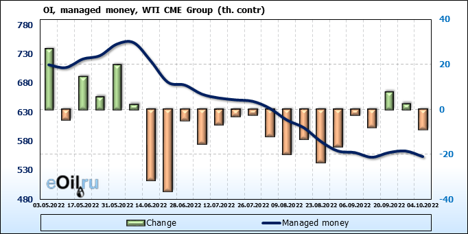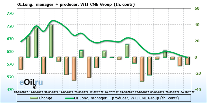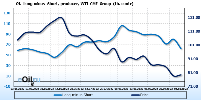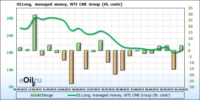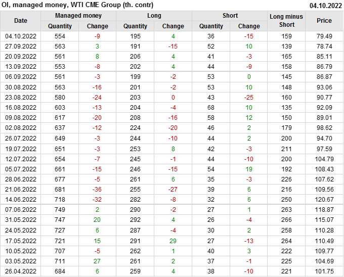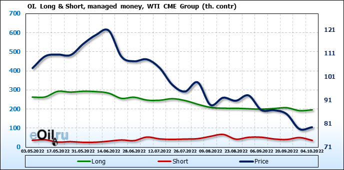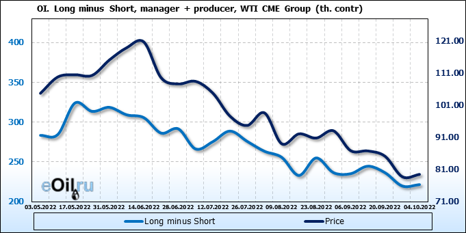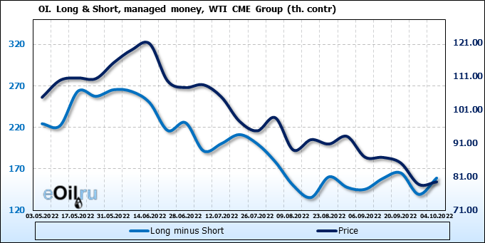 За прошлую неделю, 28.09.22 — 04.10.22, разница между длинными и короткими позициями управляющих увеличилась на 19.7 тыс. контрактов. В тоже время, цена выросла на 0.75 доллара.