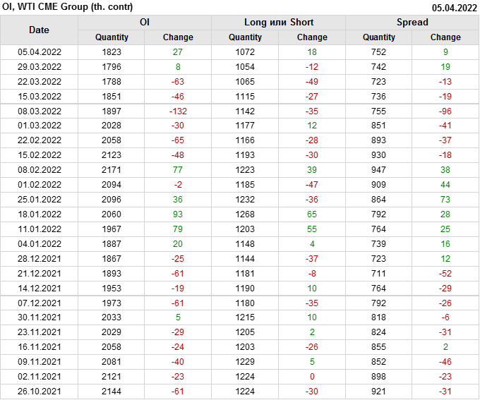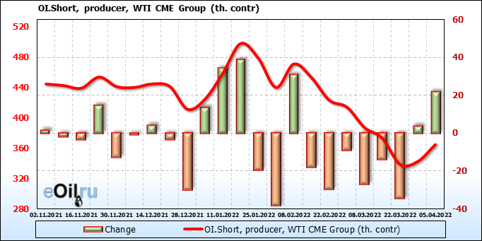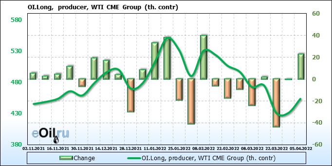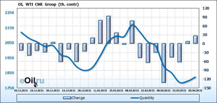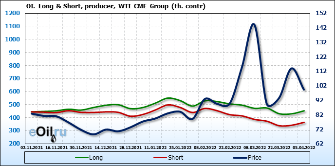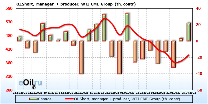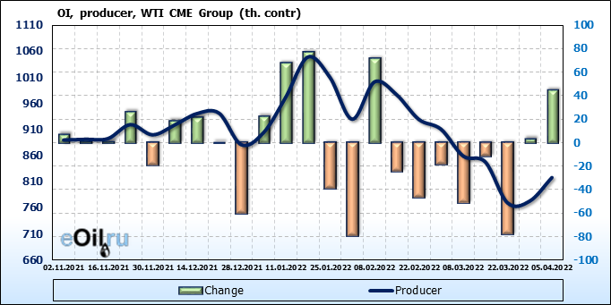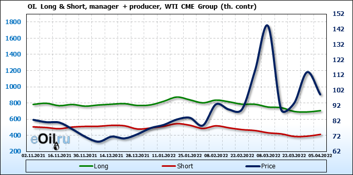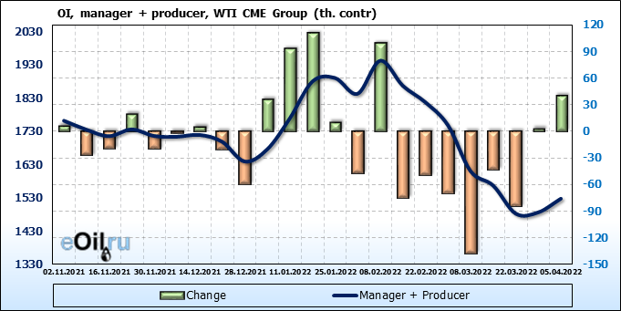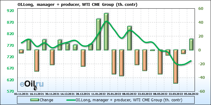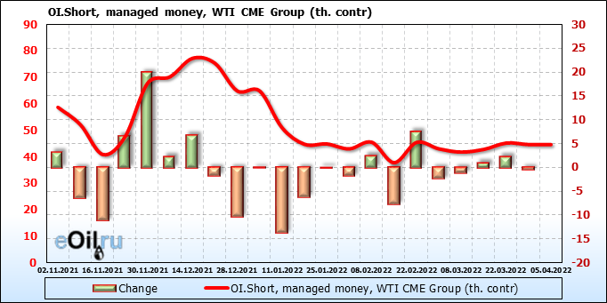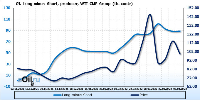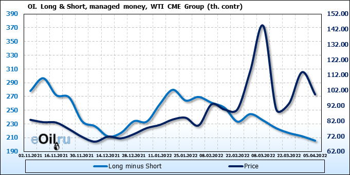 За прошлую неделю, 30.03.22 — 05.04.22, разница между длинными и короткими позициями управляющих сократилась на 6.4 тыс. контрактов. В тоже время, цена упала на 14.63 доллара.