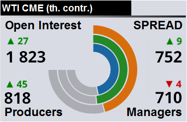 За прошлую неделю разница между OI производителей и OI управляющих выросла на 16 267 контрактов. Разница между длинными позициями производителей и управляющих выросла на 18 704 контракта. Разница между короткими позициями производителей и управляющих выросла на 2 686 контрактов.