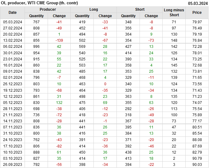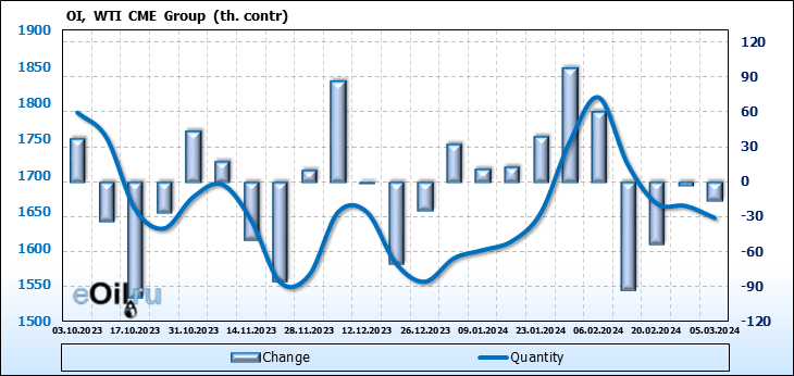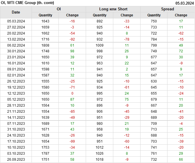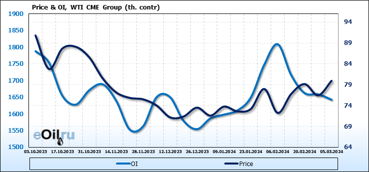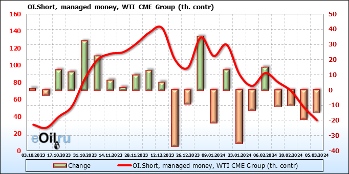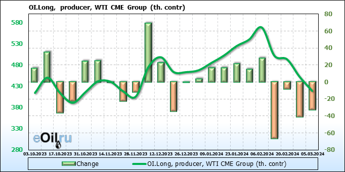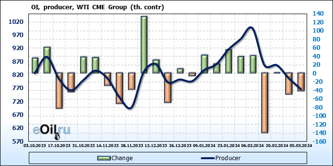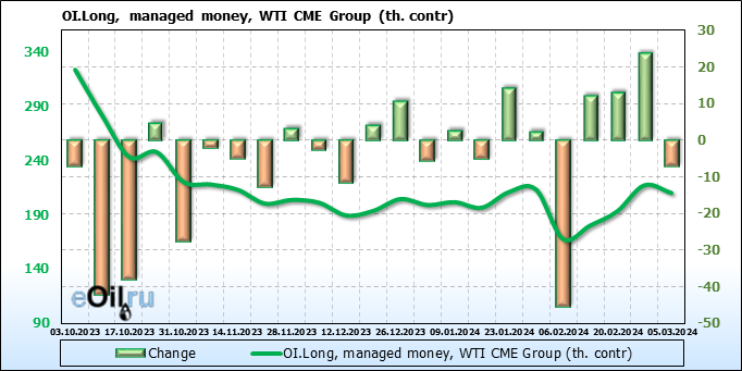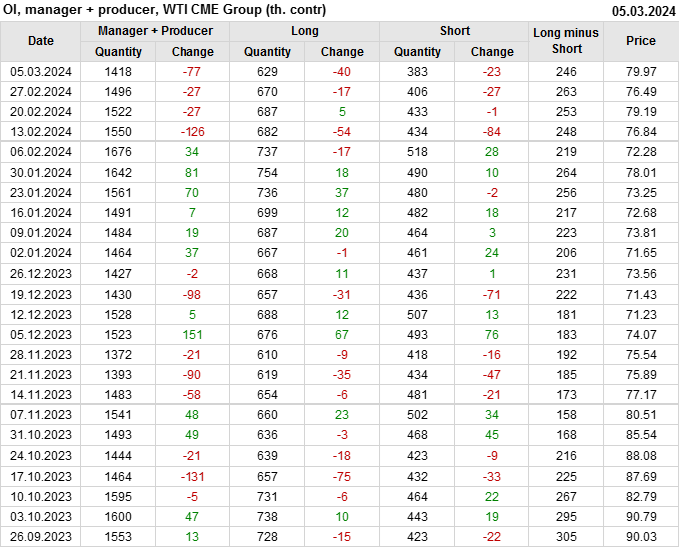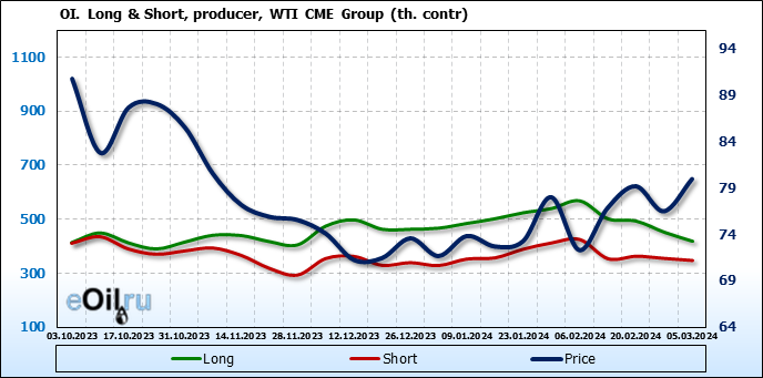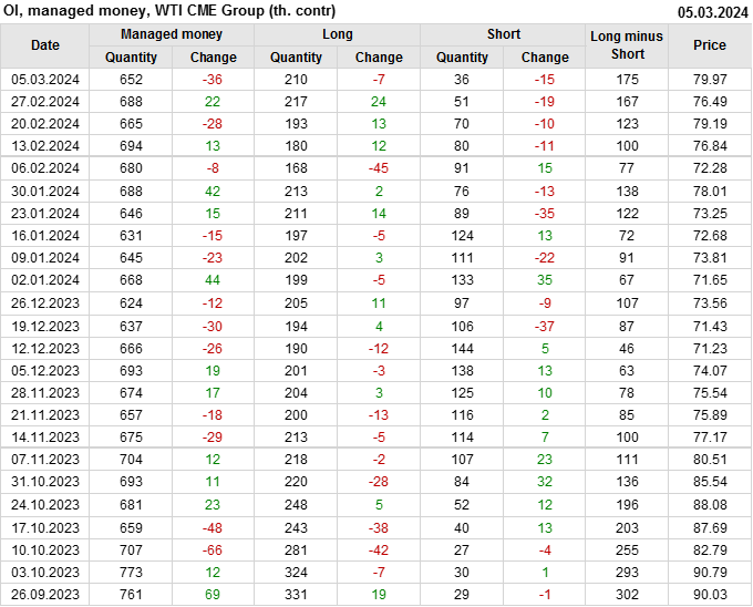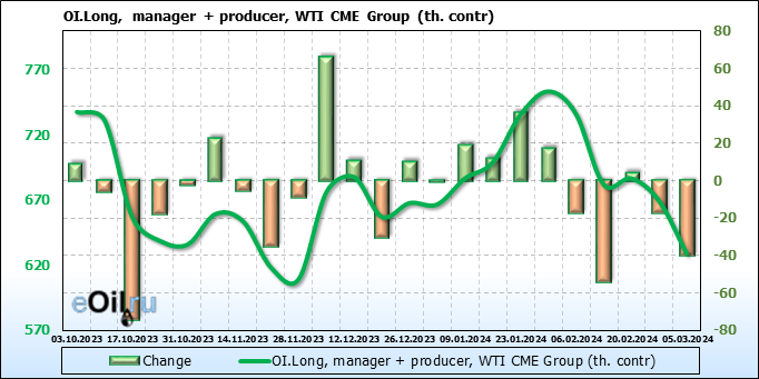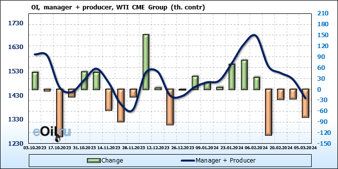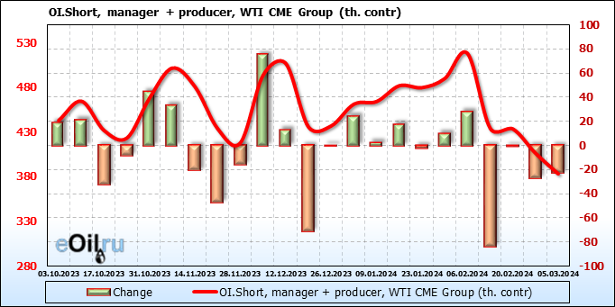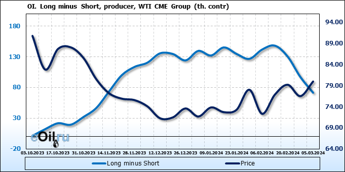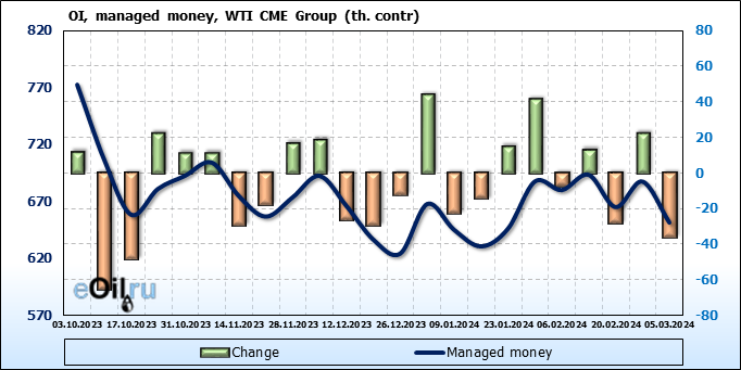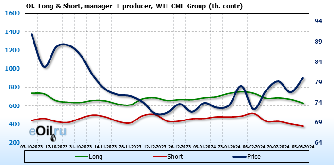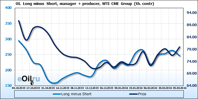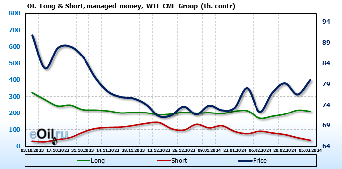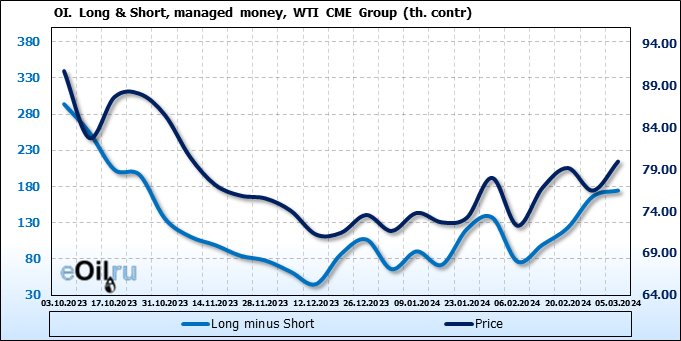 За прошлую неделю, 28.02.24 — 05.03.24, разница между длинными и короткими позициями управляющих увеличилась на 8 тыс. контрактов. В тоже время, цена выросла на 3.48 доллара.