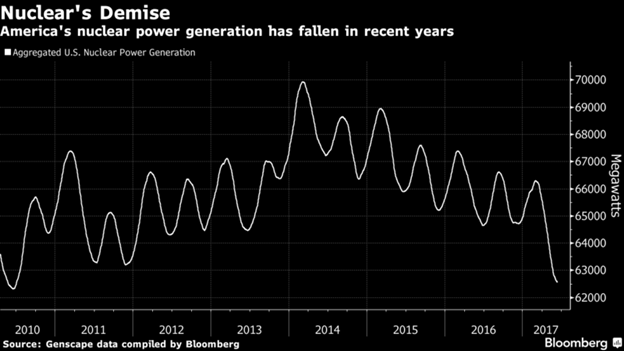 В своём докладе Bloomberg New Energy Finance предупреждает, что закрытие убыточных АЭС в США нивелирует все усилия по снижению вредных выбросов, предпринятые в энергетике страны с 2012 года. Сторонники ядерной энергии обвиняют в сложившейся ситуации правительственные регуляторы и субсидии, дающие преимущество конкурентам АЭС.