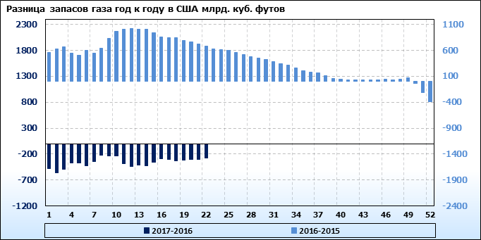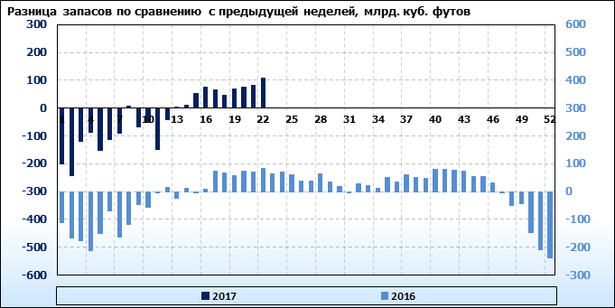 По сообщению статистической службы EIA запасы газа в США на 8.06.2017 составили 2631 млрд. куб. футов. За неделю запасы природного газа в хранилищах выросли на 106 млрд. куб. футов. По итогам недели рост запасов газа очевиден.