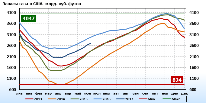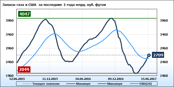По сообщению статистической службы EIA запасы газа в США на 15.06.2017 составили 2709 млрд. куб. футов. За неделю запасы природного газа в хранилищах выросли на 78 млрд. куб. футов. По итогам недели рост запасов газа очевиден.