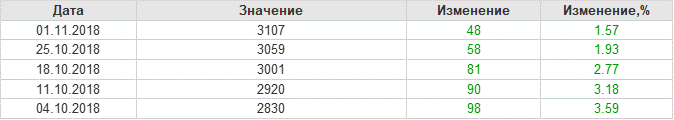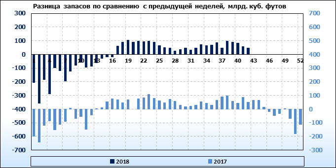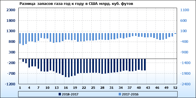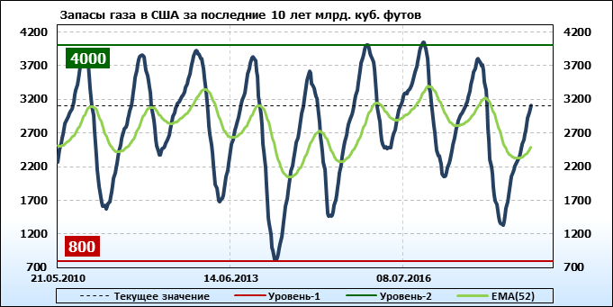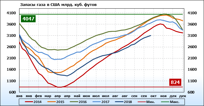 По сообщению статистической службы EIA, запасы газа в США на 1.11.2018 составили 3107 млрд. куб. футов. За неделю запасы природного газа в хранилищах выросли на 48 млрд. куб. футов. По итогам недели рост запасов газа составил 1.57 процента.
