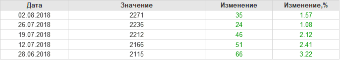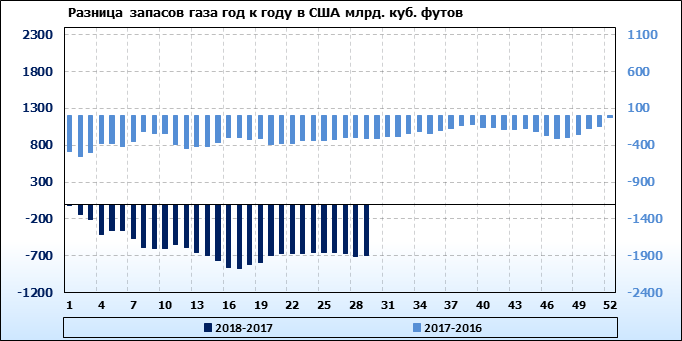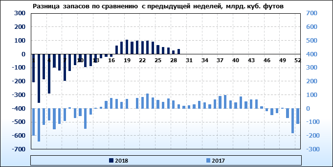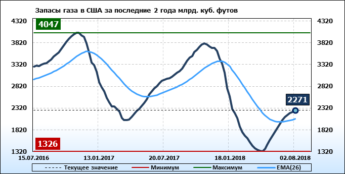 По сообщению статистической службы EIA запасы газа в США на 2.08.2018 составили 2271 млрд. куб. футов. За неделю запасы природного газа в хранилищах выросли на 35 млрд. куб. футов. По итогам недели рост запасов газа составил 1.57 процента.
