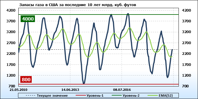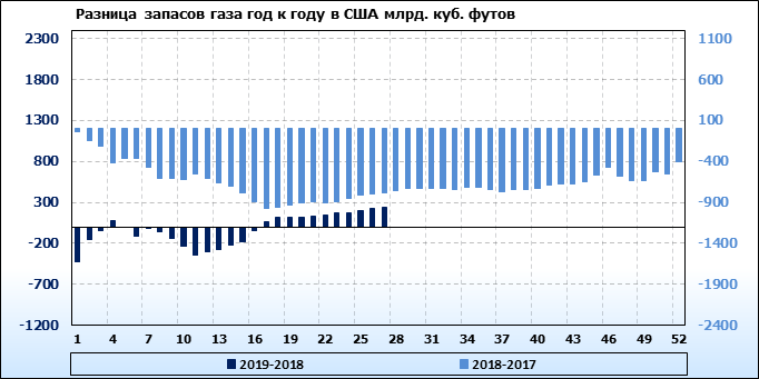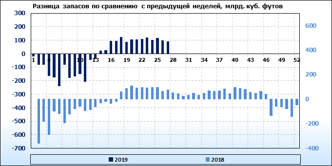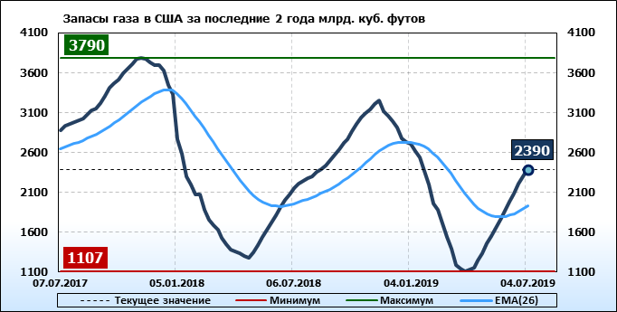 По сообщению статистической службы EIA от 03.07.2019 запасы газа в США на 27.06.2019 составили 2390 млрд. куб. футов. За неделю запасы природного газа в хранилищах выросли на 89 млрд. куб. футов. По итогам недели рост запасов газа составил 3.87 процента.