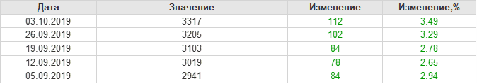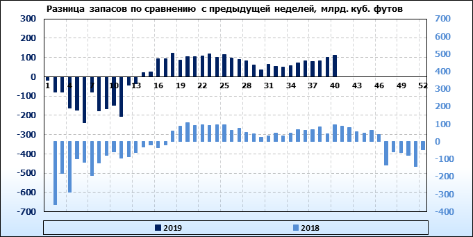 По сообщению статистической службы EIA от 03.10.2019 запасы газа в США на 26.09.2019 составили 3317 млрд. куб. футов. За неделю запасы природного газа в хранилищах выросли на 112 млрд. куб. футов. По итогам недели рост запасов газа составил 3.49 процента.