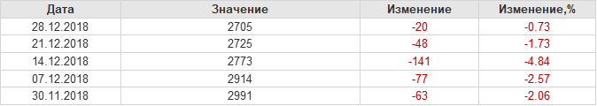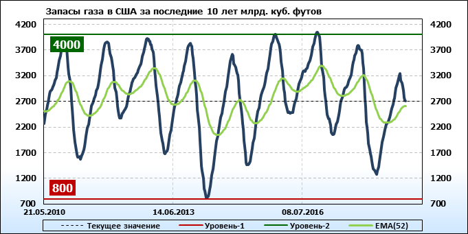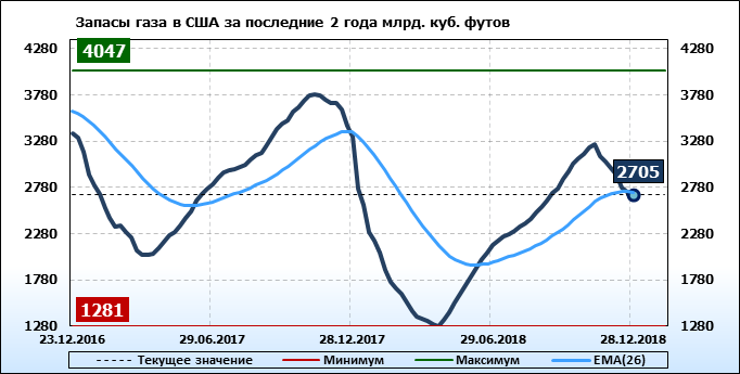 По сообщению статистической службы EIA от 04.01.2019 запасы газа в США на 28.12.2018 составили 2705 млрд. куб. футов. За неделю запасы природного газа в хранилищах упали на -20 млрд. куб. футов. По итогам недели падение запасов газа составило -0.73 процента.