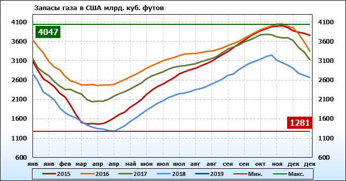 Запасы газа в США к началу отопительного сезона 2018/19 оказались ниже 5-летнего среднего значения из-за сильной летней жары и раннего осеннего похолодания, что заставило население пользоваться кондиционерами и обогревателями сверх обычного. Но поскольку добыча газа остается на рекордно высоком уровне, дефицит сокращается и может исчезнуть совсем, если холода не вернутся в ближайшее время.