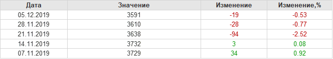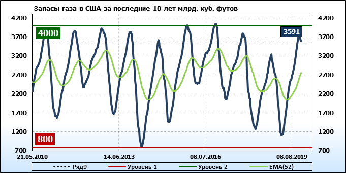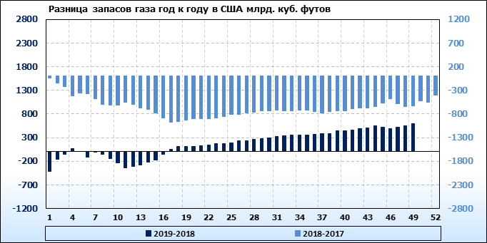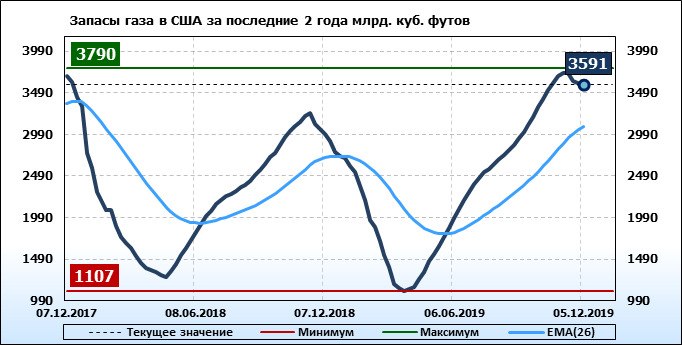 По сообщению статистической службы EIA от 05.12.2019 запасы газа в США на 28.11.2019 составили 3591 млрд. куб. футов. За неделю запасы природного газа в хранилищах упали на 19 млрд. куб. футов. По итогам недели падение запасов газа составило 0.53 процента.