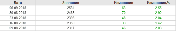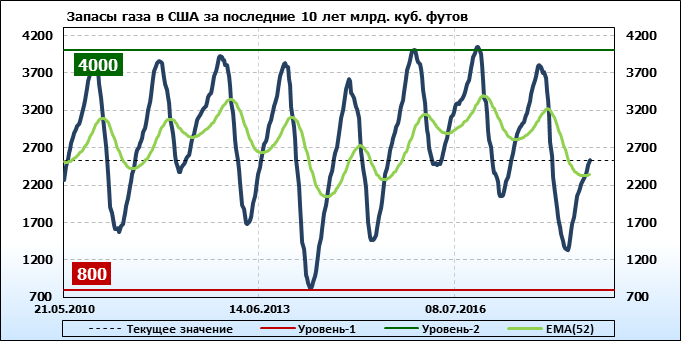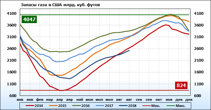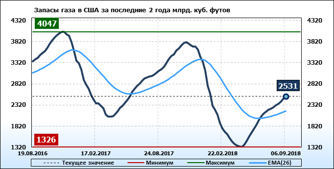 По сообщению статистической службы EIA запасы газа в США на 6.09.2018 составили 2531 млрд. куб. футов. За неделю запасы природного газа в хранилищах выросли на 63 млрд. куб. футов. По итогам недели рост запасов газа составил 2.55 процента.