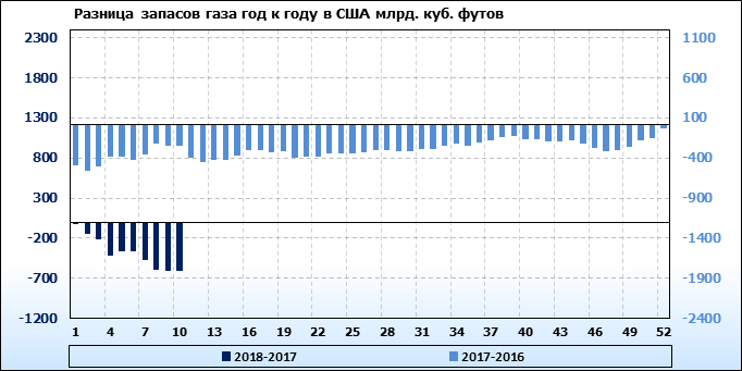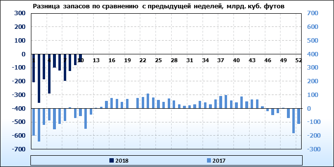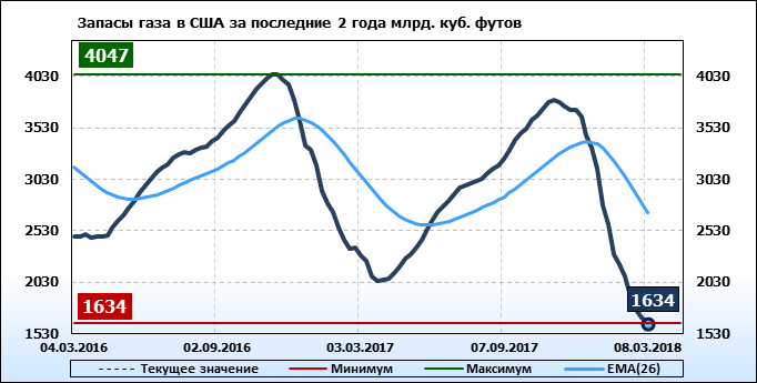 По сообщению статистической службы EIA запасы газа в США на 08.03.2018 составили 1 634 млрд. куб. футов. За неделю запасы природного газа в хранилищах упали на -57 млрд. куб. футов. По итогам недели падение запасов газа составило -3.37 процента.