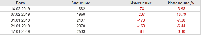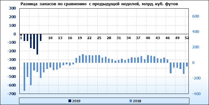 По сообщению статистической службы EIA от 14.02.2019 запасы газа в США на 07.02.2019 составили 1882 млрд. куб. футов. За неделю запасы природного газа в хранилищах упали на 78 млрд. куб. футов. По итогам недели падение запасов газа составило 3.98 процента.