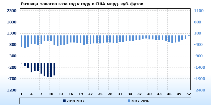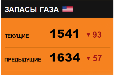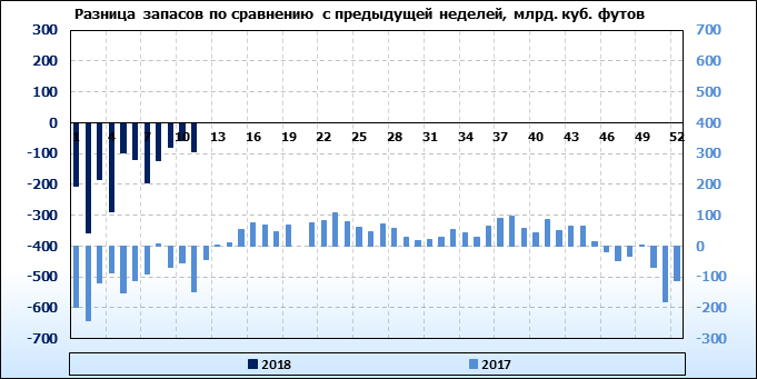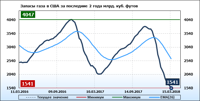 По сообщению статистической службы EIA запасы газа в США на 15.03.2018 составили 1541 млрд. куб. футов. За неделю запасы природного газа в хранилищах упали на -93 млрд. куб. футов. По итогам недели падение запасов газа составило -5.69 процентов.