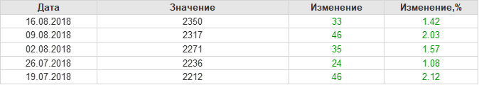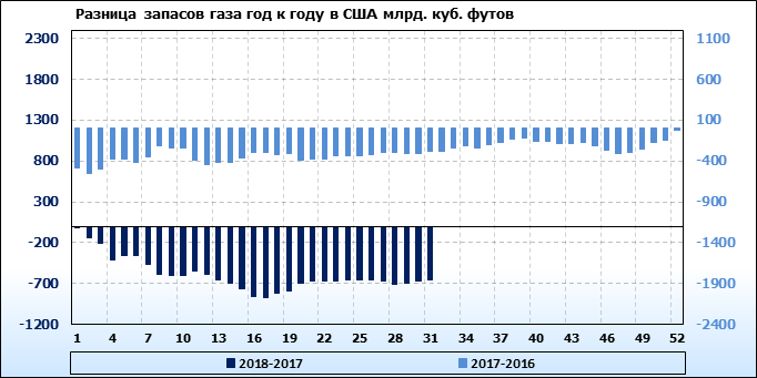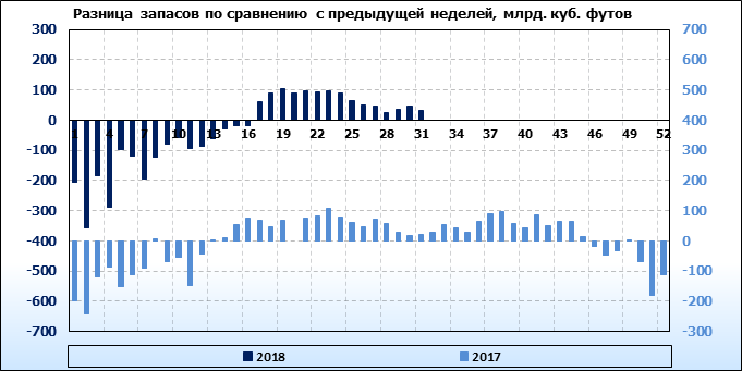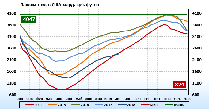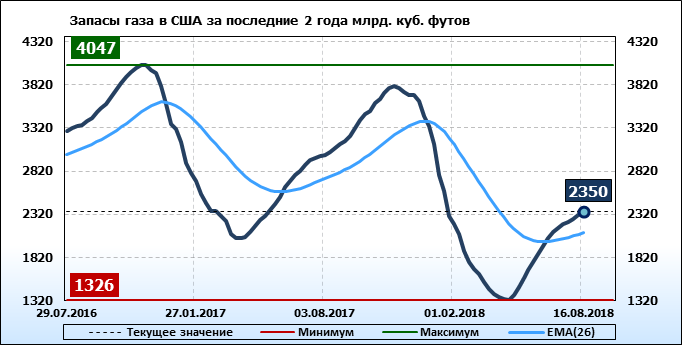 По сообщению статистической службы EIA запасы газа в США на 16.08.2018 составили 2350 млрд. куб. футов. За неделю запасы природного газа в хранилищах выросли на 33 млрд. куб. футов. По итогам недели рост запасов газа составил 1.42 процента.